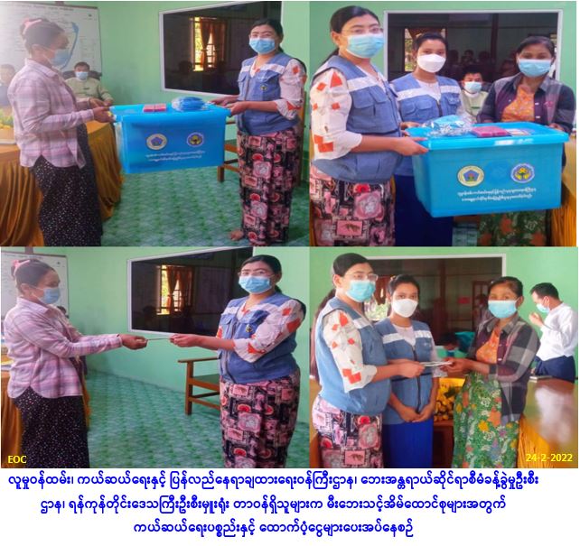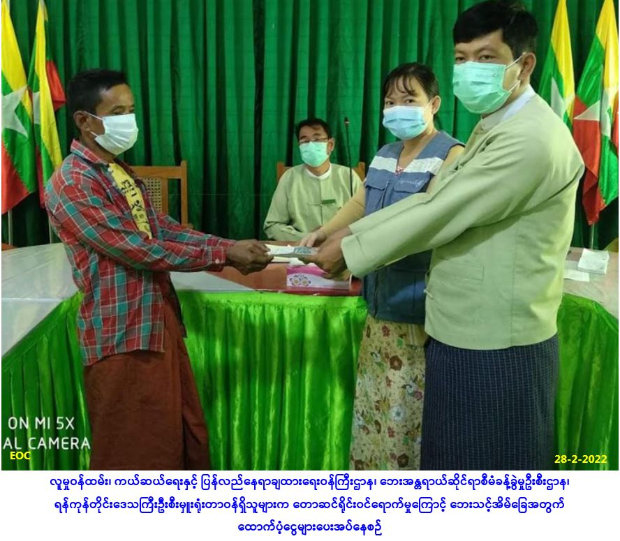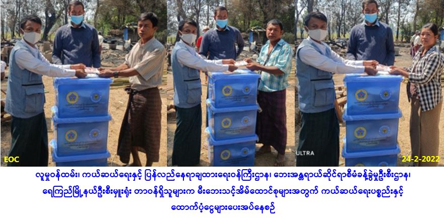 လူမှုဝန်ထမ်း၊ ကယ်ဆယ်ရေးနှင့် ပြန်လည်နေရာချထားရေးဝန်ကြီးဌာန၊ ဘေးအန္တရာယ်ဆိုင်ရာစီမံခန့်ခွဲမှုဦးစီး ဌာန၊ ရန်ကုန်တိုင်းဒေသကြီးဦးစီးမှူးရုံးမှတာဝန်ရှိသူများသည် ရန်ကုန်တိုင်းဒေသကြီး၊ သုံးခွမြို့နယ်၊ ကိုင်းကုန်း ကျေးရွာအုပ်စု၊ ကိုင်းကုန်းကျေးရွာတွင် (၁၄-၂-၂၀၂၂)ရက်နေ့၊ (၁၂း၄၀)နာရီအချိန်တွင် ဖြစ်ပွားခဲ့သော မီးဘေးကြောင့် ဘေးသင့်အိမ်ထောင်စု (၂) စုမှ လူဦးရေ (၇) ဦးတို့အတွက် အိမ်ဆောက်ပစ္စည်းဖိုးထောက်ပံ့ငွေ (၄၀၀,၀၀၀/-)၊ လူဦးရေ (၇)ဦးအတွက် ဆန်ရိက္ခာဖိုးထောက်ပံ့ငွေ (၁၄,၇၀၀/-)၊ ကယ်ဆယ်ရေးပစ္စည်း (၁၇)မျိုး (၂)အိမ်ထောင်စာနှင့် ကိုဗစ်-၁၉ ကြိုတင်ကာကွယ်နိုင်ရန် အိမ်ထောင်စု (၂) စုအတွက် ဆပ်ပြာ (၂)တောင့်၊ လူဦးရေ (၇) ဦးအတွက် … Read more