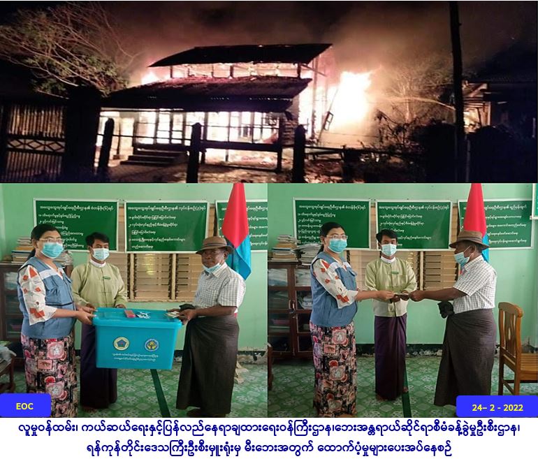 လူမှုဝန်ထမ်း၊ ကယ်ဆယ်ရေးနှင့် ပြန်လည်နေရာချထားရေးဝန်ကြီးဌာန၊ ဘေးအန္တရာယ်ဆိုင်ရာစီမံခန့်ခွဲမှုဦးစီးဌာန၊ ရန်ကုန်တိုင်းဒေသကြီး ဦးစီးမှူးရုံးမှ တာဝန်ရှိသူများသည် ရန်ကုန်တိုင်းဒေသကြီး၊ ကျောက်တန်းမြို့နယ်၊ တံတားမြို့၊ အမှတ် (၂) ရပ်ကွက်တွင် (၁၉-၂-၂၀၂၂)ရက်နေ့၊ (၂၀း၂၀)နာရီအချိန်၌မီးလောင်မှုဖြစ်ပွားခဲ့ရာ အိမ်ခြေ (၁)လုံးမီးဘေးသင့်ခဲ့ပြီး၊ အိမ်ထောင်စု (၁)စုမှ လူဦးရေ (၂) ဦး တို့ မီးဘေးသင့်ခဲ့ပါသဖြင့် မီးဘေးသင့်အိမ်ခြေ (၁)လုံးအတွက် အိမ်ဆောက်ပစ္စည်းဖိုးထောက်ပံ့ငွေကျပ် (၂၀၀၀၀၀/-) ကျပ်၊ ဆန်ရိက္ခာ ဖိုးထောက်ပံ့ငွေကျပ် (၄၂၀၀/-) ကျပ်၊ ကယ်ဆယ်ရေးပစ္စည်း (၁၇)မျိုး (၁)အိမ်ထောင်စာနှင့် ကိုဗစ်-၁၉ ကြိုတင် ကာကွယ်နိုင်ဖို့အိမ်ထောင်စု (၁)စုအတွက် … Read more