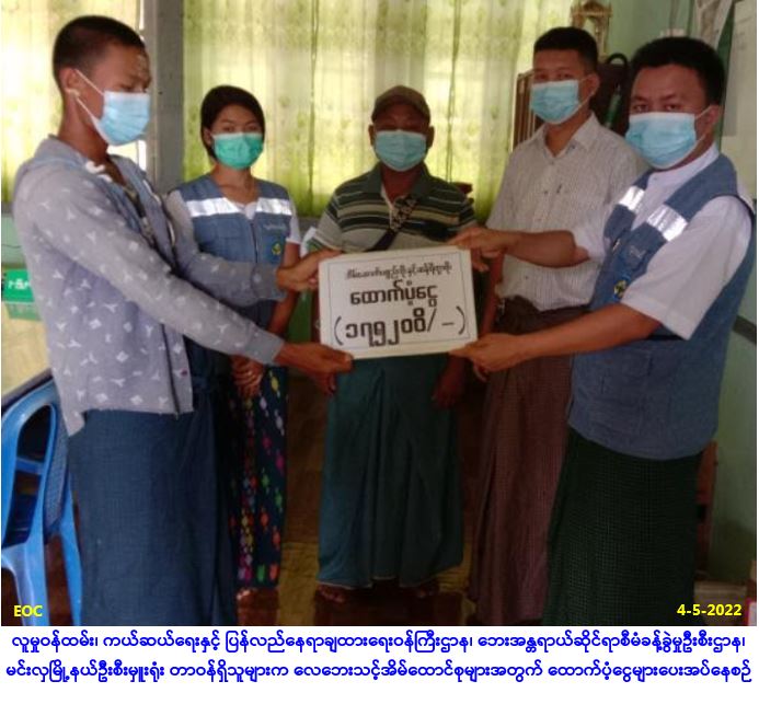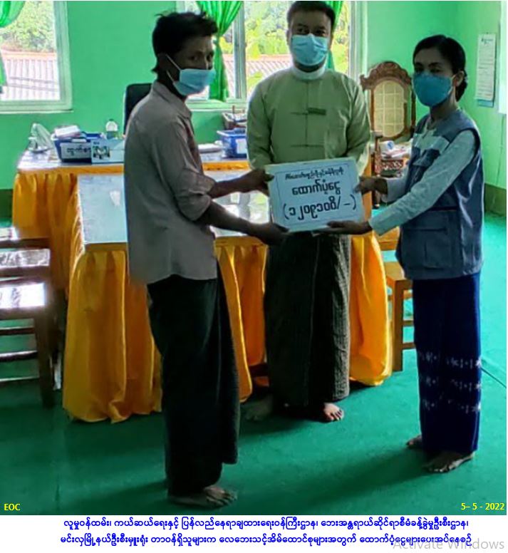 လူမှုဝန်ထမ်း၊ ကယ်ဆယ်ရေးနှင့် ပြန်လည်နေရာချထားရေဝန်ကြီးဌာန၊ ဘေးအန္တရာယ်ဆိုင်ရာစီမံခန့်ခွဲမှုဦးစီးဌာန၊ ပဲခူးတိုင်းဒေသကြီး၊ သာယာဝတီခရိုင်၊ မင်းလှမြို့နယ်ဦးစီးမှူးရုံးမှ တာဝန်ရှိသူများသည် မင်းလှမြို့နယ်၊ ထောက်ကြံ့ကျေးရွာအုပ်စု၊ ဘန့်ဘွေးပင်ကျေးရွာ၌ (၃-၅-၂၀၂၂)ရက်နေ့(၁၅း၃၀)နာရီအချိန်တွင် ဖြစ်ပွားခဲ့သော လေဘေးကြောင့် အမိုးလန်နေအိမ် (၂၁)လုံးအတွက် အိမ်ဆောက်ပစ္စည်းဖိုးထောက်ပံ့ငွေ (၁,၀၆၀,၀၀ဝ/-)၊ လူဦးရေ (၇၁) ဦးအတွက် ဆန်ရိက္ခာဖိုးထောက်ပံ့ငွေ (၁၄၉,၁၀ဝ/-)၊ စုစုပေါင်းထောက်ပံ့ငွေ (၁,၂၀၉,၁၀ဝ/-)ကျပ်တို့အား (၅-၅-၂၀၂၂)ရက်နေ့၊(၁၁:၀၀)နာရီအချိန်တွင် မြို့နယ်အထွေထွေအုပ်ချုပ်ရေးဦးစီးဌာနမှ မြို့နယ်အုပ်ချုပ်ရေးမှူးနှင့်တာဝန်ရှိသူများ၊ ကျေးရွာအုပ်ချုပ်ရေးမှူး၊ ပြန်ကြားရေးနှင့်ပြည်သူ့ဆက်ဆံရေးဦးစီးဌာနမှ တာဝန်ရှိသူများ နှင့်အတူ အထွေထွေအုပ်ချုပ်ရေးဦးစီးဌာန အစည်းအဝေးခန်းမ၌ ဘေးသင့်ပြည်သူများလက်ဝယ်သို့ ထောက်ပံ့ ပေးအပ်ခဲ့ကြောင်း သတင်းရရှိပါသည်။ #ha_sgw #bgo_may2022 … Read more
