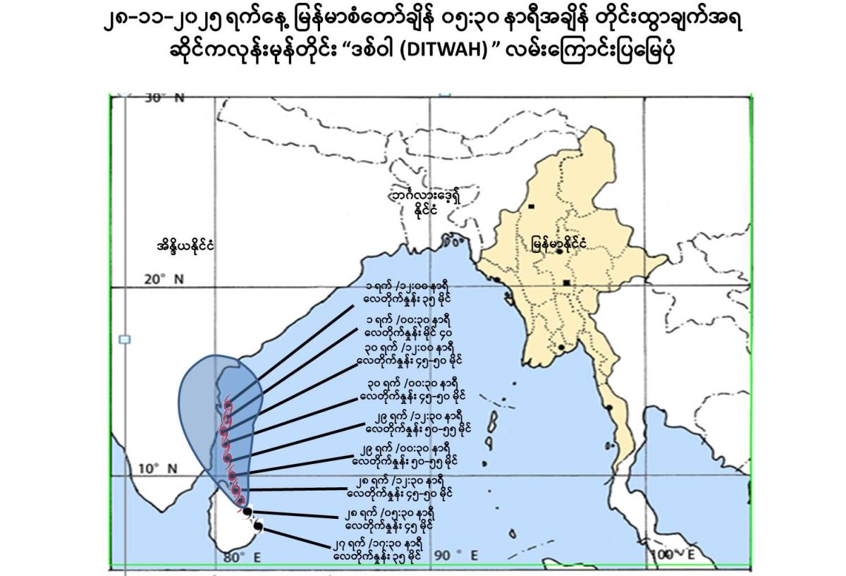 ၂၀၂၅ ခုနှစ်၊ နိုဝင်ဘာလ ၂၇ ရက်နေ့ မြန်မာစံတော်ချိန် (၁၈:၀၀) နာရီအချိန်တွင် မိုးလေဝသနှင့် ဇလဗေဒညွှန်ကြားမှုဦးစီးဌာနမှ “ဆိုင်ကလုန်းမုန်တိုင်းသတင်းအမှတ်စဉ်(၀၄/၂၀၂၅)”ကို အောက်ပါအတိုင်း ထုတ်ပြန်ထားပါသည်- ဆိုင်ကလုန်းမုန်တိုင်း သတင်း အမှတ်စဉ်(၀၄/၂၀၂၅) (က) ဆိုင်ကလုန်းမုန်တိုင်း “ဒစ်ဝါ”(DITWAH) အခြေအနေ (၁) ယနေ့မြန်မာစံတော်ချိန် ၁၇:၃၀ နာရီအချိန် တိုင်းထွာချက်များအရ ဘင်္ဂလားပင်လယ်အော် အနောက်တောင်ပိုင်းနှင့် ယင်းနှင့်ဆက်စပ်လျက်ရှိသော သီရိလင်္ကာနိုင်ငံကမ်းခြေတို့တွင် ဖြစ်ပေါ်နေသော အားကောင်းသောမုန်တိုင်းငယ် (Deep Depression) သည် မြောက်-အနောက်မြောက်ဘက်သို့ ရွေ့လျားခဲ့ပြီး ပိုမိုအားကောင်းလာကာ ဆိုင်ကလုန်းမုန်တိုင်း “ဒစ်ဝါ” (DITWAH) အဖြစ်သို့ ရောက်ရှိခဲ့ပါသည်။ အဆိုပါ ဆိုင်ကလုန်းမုန်တိုင်း “ဒစ်ဝါ”သည် မြန်မာနိုင်ငံ၊ ကိုကိုးကျွန်းမြို့ (Coco … Read more