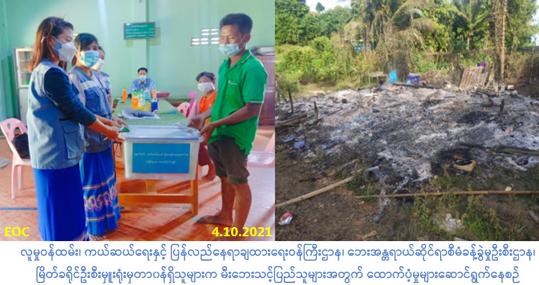 လူမှုဝန်ထမ်း၊ ကယ်ဆယ်ရေးနှင့် ပြန်လည်နေရာချထားရေးဝန်ကြီးဌာန၊ ဘေးအန္တရာယ်ဆိုင်ရာစီမံခန့်ခွဲမှုဦးစီးဌာန၊ မြိတ်ခရိုင်ဦးစီးမှူးရုံးမှ တာဝန်ရှိသူများသည်(၃-၁၀-၂၀၂၁)ရက်နေ့တွင် မြိတ်မြို့နယ်၊ ကျောက်ဖျာကျေးရွာအုပ်စု၊ ကဘင်းကျေးရွာ၊ ရှောင်ကွင်းလမ်းမကြီးဘေး၌ မီးဘေးဖြစ်ပွားခဲ့မှုကြောင့် မီးဘေးသင့်လုံးဝပျက်စီးနေအိမ်(၁)လုံးအတွက် အိမ်ဆောက်ပစ္စည်းဖိုးထောက်ပံ့ငွေ(၁၀၀,၀၀၀/-)ကျပ်၊ ဘေးသင့်လူဦးရေ(၃)ဦးအတွက် ဆန်ရိက္ခာ(၇)ရက်စာဘိုးထောက်ပံ့ငွေ (၆,၃၀၀/-)ကျပ်၊ စုစုပေါင်းထောက်ပံ့ငွေ(၁၀၆,၃၀၀/-)ကျပ်နှင့် ကယ်ဆယ်ရေးပစ္စည်း (၁၇)မျိုးပါ ပုံး(၁)ပုံးအား(၄-၁၀-၂၀၂၁)ရက်နေ့ (၁၂:၀၀)အချိန်တွင် သွားရောက်ထောက်ပံ့ပေးအပ်ခဲ့ပါကြောင်း သတင်းရရှိပါသည်။ #ha_fir #tny_oct2021 Source: မြိတ်ခရိုင်ဦးစီးမှူးရုံး (ဘစမ)