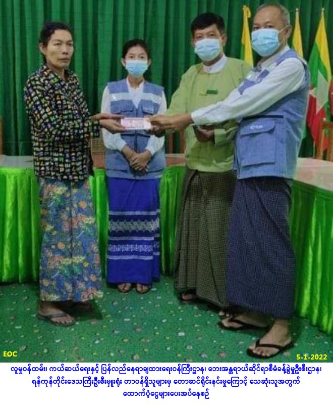 လူမှုဝန်ထမ်း၊ ကယ်ဆယ်ရေးနှင့် ပြန်လည်နေရာချထားရေးဝန်ကြီးဌာန၊ ဘေးအန္တရာယ် ဆိုင်ရာစီမံခန့်ခွဲမှုဦးစီးဌာန၊ ရန်ကုန်တိုင်းဒေသကြီးဦးစီးမှူးရုံး မှတာဝန်ရှိသူများသည် ရန်ကုန်မြောက်ပိုင်းခရိုင်၊ တိုက်ကြီးမြို့နယ်၊ ဥက္ကံမြို့၊ တဘူး ရေသိုးကျေးရွာအုပ်စု၊ ငှက်ဆိုးကွင်း၊ တောခေါင်းစုကျေးရွာ၌ (၃၀-၁၂-၂၀၂၁) ရက်နေ့၊ (၀၅း၀၀) နာရီအချိန် တွင် နေအိမ်ရှေ့ခြံဝင်းအတွင်းသို့ တောဆင်ရိုင်း (၁)ကောင်၀င်ရောက်၍ တက်နင်း သွားမှုကြောင့် သေဆုံးသူ (၁) ဦးအတွက် ထောက်ပံ့ငွေ (၃၀၀,၀၀၀/-) ကျပ်အား (၅-၁-၂၀၂၂) ရက်နေ့ (၁၁း၃၀) နာရီအချိန်တွင် တိုက်ကြီးမြို့နယ် အထွေထွေအုပ်ချုပ်ရေး ဦးစီးဌာနမှ တာဝန်ရှိသူများနှင့်အတူ ပြည်သူများ လက်ဝယ်အရောက် … Read more