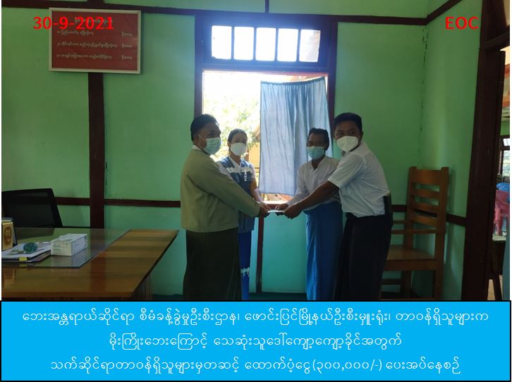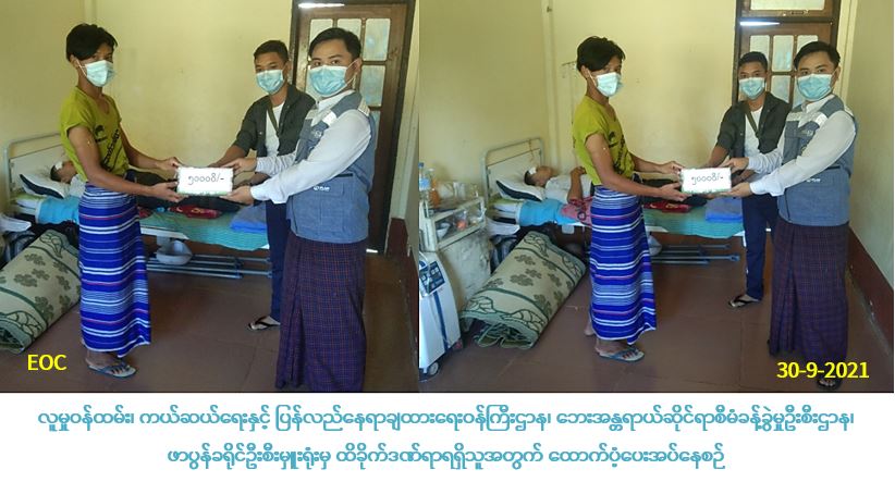 လူမှုဝန်ထမ်း၊ ကယ်ဆယ်ရေးနှင့် ပြန်လည်နေရာချထားရေးဝန်ကြီးဌာန၊ ဘေးအန္တရာယ်ဆိုင်ရာ စီမံခန့်ခွဲမှုဦးစီးဌာန၊ ဖာပွန်ခရိုင်ဦးစီးမှူးရုံးမှ တာဝန်ရှိသူသည် (၂၇-၉-၂၀၂၁) ရက်နေ့၊ (၀၆:၅၀) အချိန်ခန့်တွင် ဖာပွန်မြို့၊ မထောကျေးရွာအုပ်စု၊ မထောကျေးရွာ၌ ငါးမြုံးသွားယူစဥ် မိုင်းနင်းမိသဖြင့် ဒဏ်ရာရရှိခဲ့ရာ ဒဏ်ရာရရှိသူ(၁)ဦးအတွက် ထောက်ပံ့ငွေ (၅၀,၀၀ဝ) ကျပ်တိတိအား (၃၀-၉-၂၀၂၁) ရက်နေ့၊ (၁၁:၀၀) နာရီအချိန်ခန့်တွင် ဖာပွန်မြို့၊ တပ်မတော်ကုတင် (၁၀၀)သို့ သွားရောက်ထောက်ပံ့ခဲ့ပြီးဖြစ်ပါကြောင်း သတင်းရရှိပါသည်။ Source: ဖာပွန်ခရိုင်ဦးစီးမှူးရုံး (ဘစမ) #ha_otr #krn_oct2021