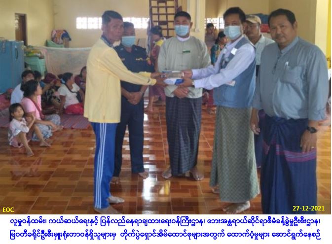 လူမှုဝန်ထမ်း၊ကယ်ဆယ်ရေးနှင့် ပြန်လည်နေရာချထားရေးဝန်ကြီးဌာန၊ ဘေးအန္တရာယ်ဆိုင်ရာစီမံခန့်ခွဲမှုဦးစီးဌာန၊ ရန်ကုန်တိုင်းဒေသကြီးဦးစီးမှူးရုံးနှင့် ရန်ကုန်အရှေ့ပိုင်းခရိုင်ဦးစီးမှူးရုံးမှ တာဝန်ရှိသူများသည် (၂၃.၁၂.၂၀၂၁)ရက်နေ့၊ (၀၈:၃၀)နာရီအချိန်၌ ရန်ကုန်အရှေ့ပိုင်းခရိုင်၊မြောက်ဥက္ကလာပမြို့နယ်၊ (ဈ)ရပ်ကွက်၊ ဘုမ္မာ-၂လမ်းတွင် မီးလောင်ကျွမ်းမှု ဖြစ်ပွားခဲ့သောကြောင့် အိမ်ခြေ(၃)လုံးအတွက် အိမ်ဆောက်ပစ္စည်းဖိုးထောက်ပံ့ငွေ(၄၉၀,၀၀ဝိ/-)၊ လူဦးရေ(၁၁)ဦးအတွက် ဆန်ရိက္ခာဖိုးငွေ(၂၃၁၀ဝိ/-)၊ စုစုပေါင်းထောက်ပံ့ငွေ(၅၁၃၁၀ဝိ/-)ကျပ်အား (၂၄.၁၂.၂၀၂၁)ရက်နေ့(၁၁:၀၀)နာရီအချိန်တွင်မြောက်ဥက္ကလာပမြို့နယ် အထွေထွေအုပ်ချုပ်ရေးဦးစီးဌာနမှ တာဝန်ရှိသူများနှင့်အတူ ဘေးသင့်ပြည်သူများ၏ လက်ဝယ်အရောက် ထောက်ပံ့ပေးအပ်ခဲ့ပါကြောင်း သတင်းရရှိပါသည်။ #ha_fir #ygn_dec_2021 Source: ရန်ကုန်တိုင်းဒေသကြီးဦးစီးမှူးရုံး(ဘစမ)