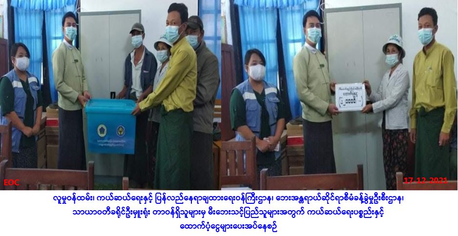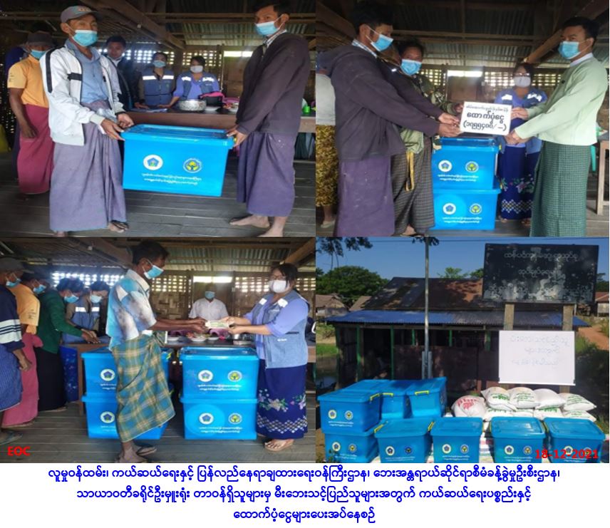 လူမှုဝန်ထမ်း၊ ကယ်ဆယ်ရေးနှင့်ပြန်လည်နေရာချထားရေးဝန်ကြီးဌာန၊ ဘေးအန္တရာယ်ဆိုင်ရာစီမံခန့်ခွဲမှုဦးစီးဌာန၊ မွန်ပြည်နယ်၊ မော်လမြိုင်ခရိုင်၊ မုဒုံမြို့နယ်ဦးစီးမှူးရုံးမှ တာဝန်ရှိသူများသည် (၁၉.၁၂.၂၀၂၁)ရက်နေ့၌ မုဒုံမြို့နယ်၊ ဝက်တဲကျေးရွာတွင် ဖြစ်ပွားခဲ့သောမီးလောင်မှုကြောင့်ပျက်စီးဆုံးရှုံးသွားခဲ့သည့် လူနေအိမ်(၂)လုံးမှ အိမ်ထောင်စု(၂)စုအတွက် အိမ်ဆောက်ပစ္စည်းဖိုးငွေ (၄၀၀,၀၀ဝိ/-)၊ ကယ်ဆယ်ရေးပစ္စည်း(၁၇)မျိုး (၂)အိမ်ထောင်စာအတွက်တန်ဖိုးငွေ (၉၈,၀၇၂/-)၊ နှင့်မီးဘေးသင့်လူဦးရေ(၆)ဦးအတွက်(၇)ရက်စာဆန်ဖိုးငွေ(၁၂,၆၀ဝိ/-)တို့အား (၂၀.၁၂.၂၀၂၁)ရက်နေ့၊ (၁၅:၀၀)နာရီအချိန်တွင် မီးဘေးသင့်ပြည်သူများလက်ဝယ်အရောက် ထောက်ပံ့ပေးအပ်ခဲ့ပါကြောင်း သတင်းရရှိပါသည်။ #ha_fir #mon_Dec_2021 Source: မုဒုံမြို့နယ်ဦးစီးမှူးရုံး(ဘစမ)