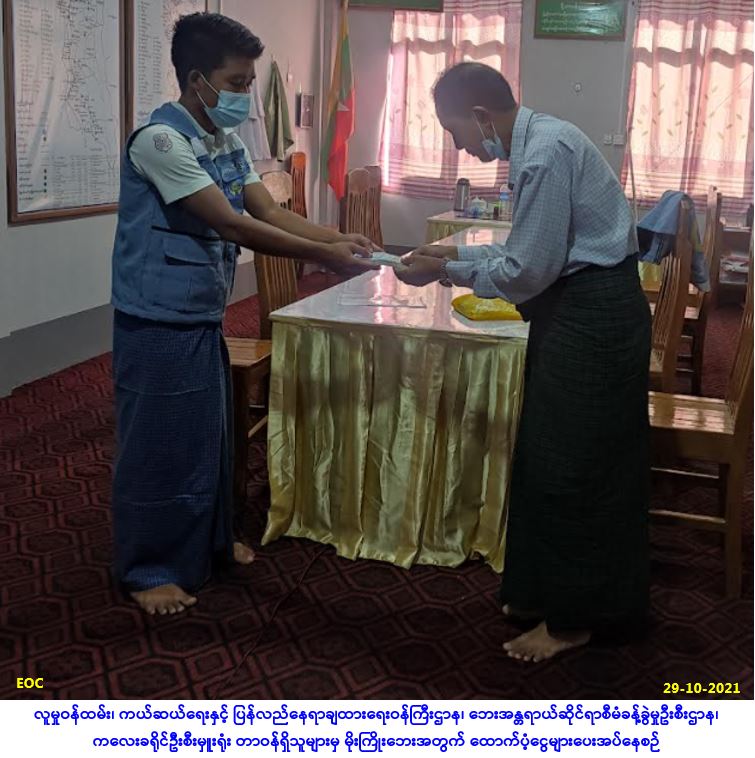 လူမှုဝန်ထမ်း၊ ကယ်ဆယ်ရေးနှင့် ပြန်လည်နေရာချထားရေးဝန်ကြီးဌာန၊ ဘေးအန္တရာယ်ဆိုင်ရာစီမံခန့်ခွဲမှုဦးစီးဌာန၊ သာယာဝတီခရိုင်ဦးစီးမှူးရုံးမှ တာဝန်ရှိသူများသည် (၄-၁၁-၂၀၂၁) ရက်နေ့ (၀၄:၃၀) အချိန်၌ သာယာဝတီခရိုင်၊ အုတ်ဖိုမြို့နယ်၊ နှောကုန်းကျေးရွာအုပ်စု၊ နှောကုန်းကျေးရွာတွင် ဖြစ်ပွားသော လေဘေးမှ တစ်စိတ်တစ်ပိုင်းပျက်စီးနေအိမ်(၁)လုံးအတွက် အိမ်ဆောက်ပစ္စည်းဖိုးထောက်ပံ့ငွေ (၃၀,၀၀ဝ)ကျပ်၊ အိမ်ထောင်စု(၁)စုရှိ လူဦးရေ(၄)ဦးတို့အတွက် ဆန်ဖိုးထောက်ပံ့ငွေ (၈,၄၀၀) ကျပ်၊ စုစုပေါင်းထောက်ပံ့ငွေ (၃၈,၄၀၀) ကျပ်တို့အား (၅-၁၁-၂၀၂၁) ရက်နေ့ (၀၉:၃၀) နာရီအချိန်တွင် မြို့နယ်အထွေထွေအုပ်ချုပ်ရေးဦးစီးဌာနမှ ရပ်ကျေးစာရေး၊ ရပ်ကွက်/ကျေးရွာအုပ်ချုပ်ရေးမှူးများ၊ ရပ်မိ/ရပ်ဖများနှင့်အတူ လက်ဝယ်အရောက် ထောက်ပံ့ပေးအပ်ခဲ့ပါကြောင်း သတင်းရရှိပါသည်။ Source: သာယာဝတီခရိုင်ဦးစီးမှူးရုံး … Read more