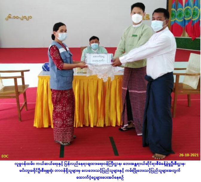 လူမူဝန်ထမ်း၊ ကယ်ဆယ်ရေးနှင့် ပြန်လည်နေရာချထားရေးဝန်ကြီးဌာန၊ ဘေးအန္တရာယ်ဆိုင်ရာစီမံခန့်ခွဲမှုဦးစီးဌာန၊ လားရှိုးခရိုင်ဦးစီးမှူးရုံးမှ တာဝန်ရှိသူများသည် (၂၀.၁၀.၂၀၂၁) ရက်နေ့တွင် သိန္နီမြို့နယ်၊ နားငင်းကျေးရွာအုပ်စု၊ ဟိုလောင်းကျေးရွာနမှ အိမ်ထောင်စု(၁၈)စု၊ ကျား(၆၈)ဦး၊ မ(၅၅)ဦး၊ စုစုပေါင်း(၁၂၃)ဦးတို့သည် တိုက်ပွဲများဖြစ်ပွားမည်ကို စိုးရိမ်သဖြင့် လားရှိုးမြို့နယ်၊ နမ့်တွန်းကျေးရွာသို့ တိမ်းရှောင်လာရာ အဆိုပါတိုက်ပွဲရှောင်ပြည်သူ(၁၂၃)ဦးအတွက် ထောက်ပံ့ငွေ (၂၅၈၃၀၀/-)ကျပ်တိတိအား (၂၅.၁၀.၂၀၂၁) ရက်နေ့တွင် ထောက်ပံ့ပေးအပ်ခဲ့ပါကြောင်း သတင်းရရှိပါသည်။ #otr #shn_oct_2021 Source: လားရှိုးခရိုင်ဦးစီးမှူးရုံး(ဘစမ)