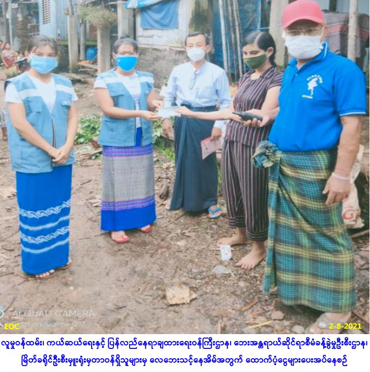 လူမှုဝန်ထမ်း၊ ကယ်ဆယ်ရေးနှင့် ပြန်လည်နေရာချထားရေးဝန်ကြီးဌာန၊ ဘေးအန္တရာယ်ဆိုင်ရာ စီမံခန့်ခွဲမှုဦးစီးဌာန၊ မြိတ်ခရိုင်ဦးစီးမှူးရုံးမှတာဝန်ရှိသူများသည် (၃၁-၇-၂၀၂၁)ရက်နေ့တွင် မြိတ်မြို့နယ်၊ အလယ်ကျွန်းရပ်ကွက်၊ ပန်စရာရပ်၊ အေးရိပ်သာလမ်းသွယ်(၂)တွင် မိုးသည်းထန်စွာရွာသွန်းပြီး လေပြင်း တိုက်ခတ်မှုကြောင့် အနောက်ဘက်အမိုးပေါ်သို့ သစ်ပင်ပြိုလဲခဲ့ကာ တစ်စိတ်တစ်ပိုင်းပျက်စီးခဲ့သည့် လေဘေးသင့်နေအိမ် (၁)လုံးအတွက် အိမ်ဆောက်ပစ္စည်းဖိုးထောက်ပံ့ငွေ (၄၀,၀၀၀/-)ကျပ်၊ ဘေးသင့် လူဦးရေ(၆)ဦးအတွက် (၇) ရက်စာဆန်ရိက္ခာဖိုးငွေ (၁၂,၆၀၀/-)ကျပ်၊ စုစုပေါင်းထောက်ပံ့ငွေ (၅၂,၆၀၀/-)ကျပ်တို့အား(၂-၈-၂၀၂၁)ရက်နေ့(၁၄း၂၀)နာရီအချိန်တွင် သွားရောက်ထောက်ပံ့ပေးအပ်ခဲ့ကြောင်း သတင်းရရှိပါသည်။ #ha_sgw #tny_aug2021 Source: မြိတ်ခရိုင်ဦးစီးမှူးရုံး(ဘစမ)
