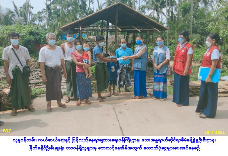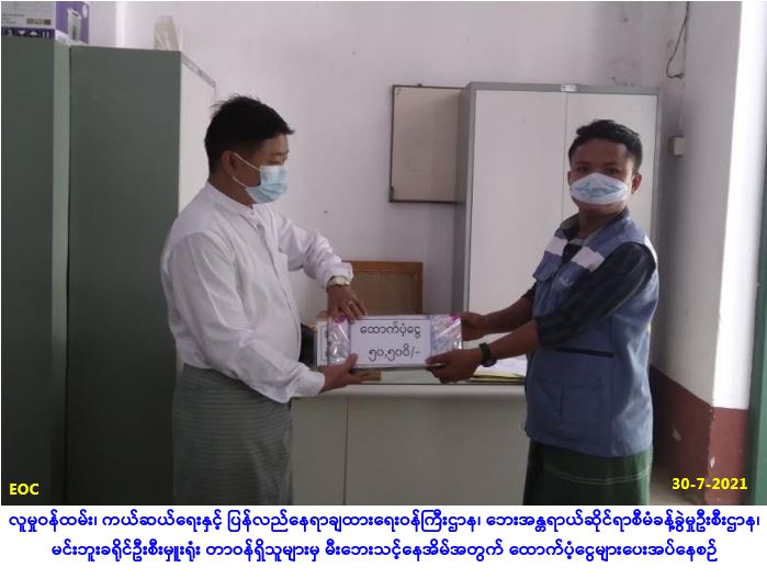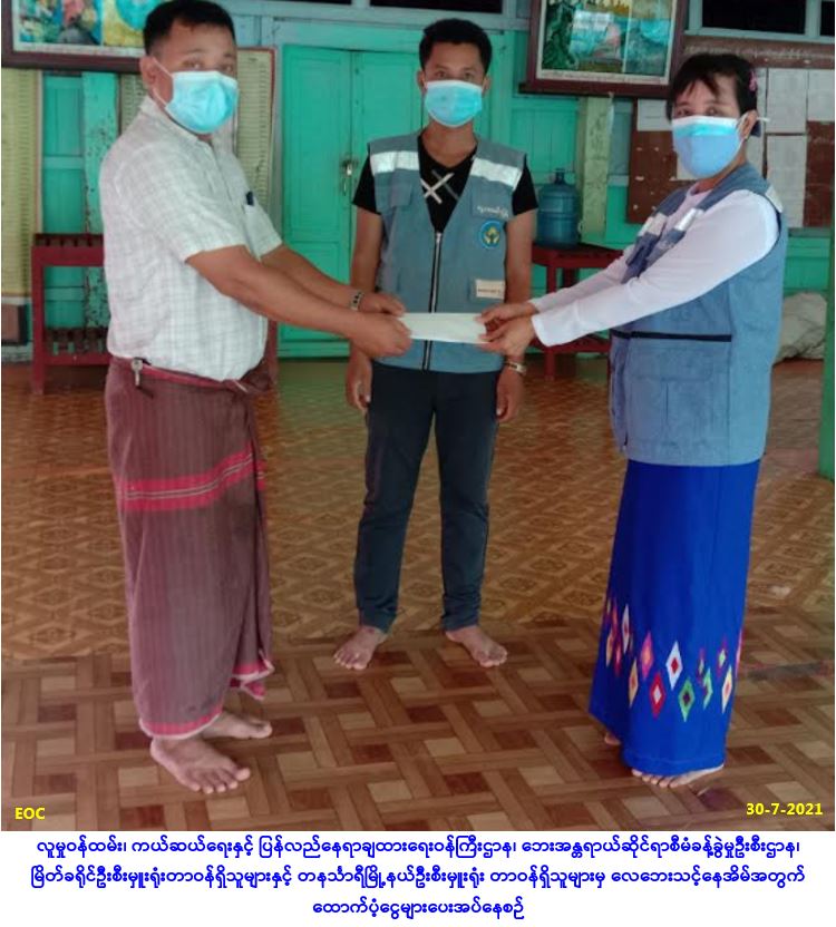 လူမှုဝန်ထမ်း၊ ကယ်ဆယ်ရေးနှင့် ပြန်လည်နေရာချထားရေးဝန်ကြီးဌာန၊ ဘေးအန္တရာယ်ဆိုင်ရာ စီမံခန့်ခွဲမှုဦးစီးဌာန၊ မြိတ်ခရိုင်ဦးစီးမှူးရုံးမှတာဝန်ရှိသူများနှင့် တနင်္သာရီမြို့နယ်ဦးစီးမှူးရုံးမှ တာဝန်ရှိသူများသည် (၂၉-၇-၂၀၂၁)ရက်နေ့တွင် တနင်္သာရီမြို့နယ်၊ သကျက်ကျေးရွာအုပ်စု၊ တောင်ဘိန်း (၁)ကျေးရွာတွင် ဖြစ်ပွားခဲ့သော လေဘေးကြောင့် ဘေးသင့်တစ်စိတ်တစ်ပိုင်း ပျက်စီး နေအိမ်(၁)လုံးအတွက် အိမ်ဆောက်ပစ္စည်းဖိုးငွေ(၆၀,၀၀၀/)ကျပ်၊ ဘေးသင့်လူဦးရေ(၆)ဦးအတွက် ဆန်ရိက္ခာဖိုးငွေ(၇)ရက်စာ (၁၂,၆၀၀/-)ကျပ်၊ စုစုပေါင်းထောက်ပံ့ငွေ (၇၂,၆၀၀/-) ကျပ်တို့အား (၃၀-၇-၂၀၂၁)ရက်နေ့၊ (၁၂းဝဝ)နာရီအချိန်တွင် သွားရောက်ထောက်ပံ့ပေးအပ်ခဲ့ကြောင်း သတင်းရရှိပါ သည်။ #ha_sgw #tny_jul2021 Source: မြိတ်ခရိုင်ဦးစီးမှူးရုံး၊တနင်္သာရီမြို့နယ်ဦးစီးမှူးရုံး (ဘစမ)