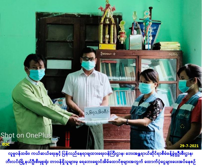 လူမှုဝန်ထမ်း၊ ကယ်ဆယ်ရေးနှင့် ပြန်လည်နေရာချထားရေးဝန်ကြီးဌာန၊ ဘေးအန္တရာယ်ဆိုင်ရာ စီမံခန့်ခွဲမှုဦးစီးဌာန၊ မွန်ပြည်နယ်၊ သထုံခရိုင်၊ ဘီးလင်းမြို့နယ်ဦးစီးမှူးရုံးမှတာဝန်ရှိသူများသည် (၂၇-၇-၂၀၂၁)ရက်နေ့မှစ၍ ဘီးလင်းမြစ်ရေဝင်ရောက်မှုကြောင့် ဘီးလင်းမြို့ပေါ်ရှိ မြေနိမ့်ပိုင်း ဖြစ်သော ကန်သာယာရပ်ကွက်၊ ဘိုးရာဇာရပ်ကွက်၊ ဆရာစံရပ်ကွက်၊ ဘိုးလှကြီးရပ်ကွက်၊ ကဒီပု ကျေးရွာအုပ်စု၊ ကျားကွင်းကျေးရွာအုပ်စု၊ ညောင်ပုလင် ကျေးရွာအုပ်စုနှင့် ရွှေလှေကျေးရွာအုပ်စု တို့မှ ကယ်ဆယ်ရေးစခန်း (၁၂) ခုရှိ ရေဘေးရှောင်အိမ်ထောင်စု(၁၇၈)စု လူဦးရေ( ၇၉၆) ဦးတို့အတွက် ဆန်ရိက္ခာဖိုးငွေ (၇) ရက်စာ (၁,၆၇၁,၆၀၀/-) ကျပ်တို့အား (၂၉-၇-၂၀၂၁) ရက်နေ့ တွင် (၁၄:၀၀) နာရီအချိန်တွင်မြို့နယ်စီမံအုပ်ချုပ်ရေးအဖွဲ့၊ … Read more