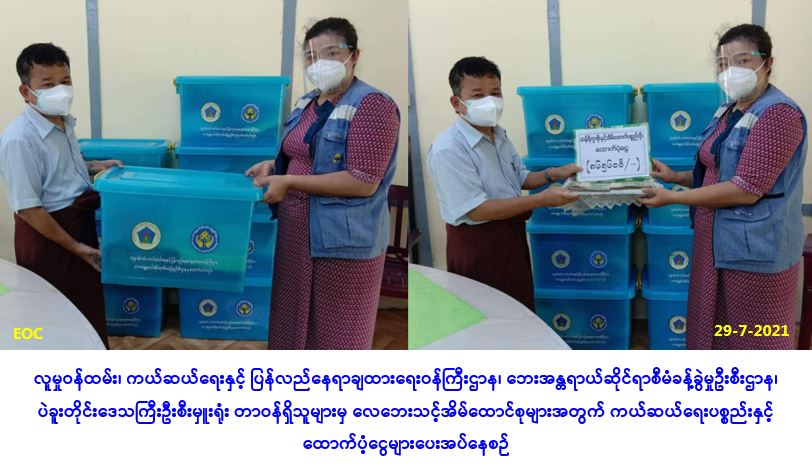 လူမှုဝန်ထမ်း၊ ကယ်ဆယ်ရေးနှင့် ပြန်လည်နေရာချထားရေးဝန်ကြီးဌာန၊ ဘေးအန္တရာယ်ဆိုင်ရာ စီမံခန့်ခွဲမှုဦးစီးဌာန၊ ပဲခူးတိုင်းဒေသကြီးဦးစီးမှူးရုံးမှ တာဝန်ရှိသူများသည် ပဲခူးခရိုင်၊ ဝေါမြို့နယ်၊ စိုင်တီစုကျေးရွာအုပ်စု၌ (၂၃-၇-၂၀၂၁) ရက်နေ့တွင် ဖြစ်ပွားခဲ့သော လေဘေးမှ အမိုးလန်နေအိမ် (၆) လုံး၊ ပြိုလဲနေအိမ် (၂)လုံးတို့အတွက် အိမ်ဆောက်ပစ္စည်းဖိုးထောက်ပံ့ငွေ(၇၉၀,၀၀ဝ/-)၊ လူဦးရေ (၃၆) ဦးအတွက် ဆန်ရိက္ခာဖိုးထောက်ပံ့ငွေ(၇၅,၆၀ဝ/-)၊ စုစုပေါင်းထောက်ပံ့ငွေ(၈၆၅,၆၀ဝ/-)ကျပ်နှင့် ကယ်ဆယ်ရေးပစ္စည်း (၁၇)မျိုး (၂) အိမ်ထောင်စာ၊ ကတ္ထူစက္ကူပုံး(၂)ပုံးတို့ကိုလည်းကောင်း၊(၂၄-၇-၂၀၂၁) ရက်နေ့ ဝေါမြို့နယ်၊ ဆင်ရွာကျေးရွာအုပ်စုတွင် ဖြစ်ပွားခဲ့သော လေဘေးမှ အမိုးလန်နေအိမ် (၇)လုံး၊ ပြိုလဲနေအိမ် (၆)လုံးတို့အတွက် အိမ်ဆောက်ပစ္စည်းဖိုးထောက်ပံ့ငွေ … Read more