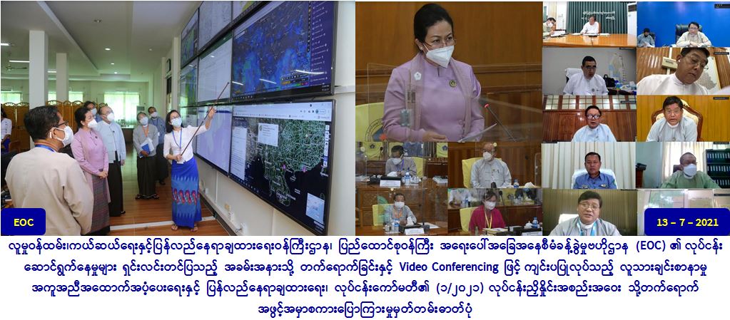 လူမှုဝန်ထမ်း၊ကယ်ဆယ်ရေးနှင့်ပြန်လည်နေရာချထားရေးဝန်ကြီးဌာန၊ ပြည်ထောင်စုဝန်ကြီး အရေးပေါ်အခြေအနေစီမံခန့်ခွဲမှုဗဟိုဌာန (EOC)၏ လုပ်ငန်းဆောင်ရွက်နေမှုများ ရှင်းလင်းတင်ပြသည့် အခမ်းအနားသို့ တက်ရောက်ခြင်းနှင့် Video Conferencing ဖြင့် ကျင်းပပြုလုပ်သည့် လူသားချင်းစာနာမှု အကူအညီအထောက်အပံ့ပေးရေးနှင့် ပြန်လည်နေရာချထားရေး၊ လုပ်ငန်းကော်မတီ၏ (၁/၂၀၂၁) လုပ်ငန်းညှိနှိုင်းအစည်းအဝေး သို့တက်ရောက် အဖွင့်အမှာစကားပြောကြား