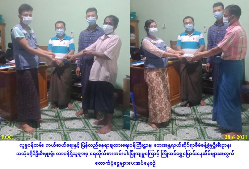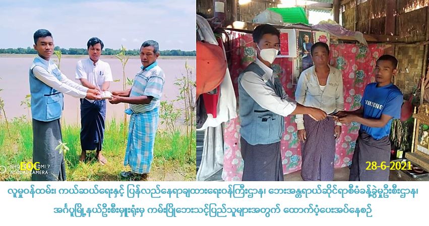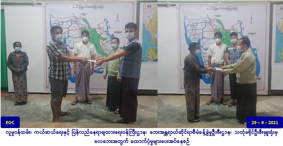 လူမှုဝန်ထမ်း၊ ကယ်ဆယ်ရေးနှင့် ပြန်လည်နေရာချထားရေးဝန်ကြီးဌာန၊ ဘေးအန္တရာယ်ဆိုင်ရာစီမံခန့်ခွဲမှု ဦးစီးဌာန၊ အင်္ဂပူမြို့နယ်ဦးစီးမှူးရုံးမှ တာဝန်ရှိသူများသည် နောက်မီးအုပ်စုကြို့ကုန်းကျေးရွာတွင် (၂၄-၆-၂၀၂၁) ရက်နေ့တွင် ဖြစ်ပွားခဲ့သော ကမ်းပြိုဘေးကြောင့် ကြိုတင်ရွှေ့ပြောင်းခဲ့ရသော လူနေအိမ်ခြေ(၄)လုံး၊ အိမ်ထောင်စု(၄)စု အတွက် အိမ်ဆောက်ပစ္စည်းဖိုးငွေ (၄၀၀,ဝဝဝ) ကျပ်၊ လူဦးရေ (၁၈) ဦးအတွက် ဆန်ရိက္ခာ(၇)ရက်စာဖိုးထောက်ပံ့ငွေ (၃၇,၈၀ဝ)ကျပ်၊ စုစုပေါင်းထောက်ပံ့မှုတန်ဖိုးငွေ (၄၃၇,၈၀၀) ကျပ်နှင့် သက္ကယ်ပြင်(သံ)အုပ်စု၊ ကညင်ရိုးကျေးရွာတွင် (၂၅-၆-၂၀၂၁) ရက်နေ့တွင် ဖြစ်ပွားခဲ့သော ကမ်းပြိုဘေးကြောင့် ကြိုတင်ရွှေ့ပြောင်းခဲ့ရသော လူနေအိမ်ခြေ(၇)လုံး၊ အိမ်ထောင်စု (၇) စုအတွက် အိမ်ဆောက်ပစ္စည်းဖိုးငွေ ( … Read more