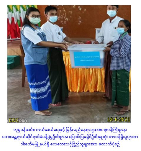လူမှုဝန်ထမ်း၊ ကယ်ဆယ်ရေးနှင့် ပြန်လည်နေရာချထားရေးဝန်ကြီးဌာန၊ ဘေးအန္တရာယ်ဆိုင်ရာ စီမံခန့်ခွဲမှုဦးစီးဌာန မြောင်းမြခရိုင်ဦးစီးမှူးရုံးမှ တာဝန်ရှိသူများသည် မြောင်းမြခရိုင်၊ ဝါးခယ်မမြို့နယ်အတွင်း မန်းကလဲ့ငုတောကျေးရွာအုပ်စု၊ မန်းကလဲ့ကျေးရွာတွင် (၁၆-၆-၂၀၂၁) ရက်နေ့၌ ဖြစ်ပွားခဲ့သော လေဘေးကြောင့် ပြိုကျပျက်စီးနေအိမ်(၁)လုံး၊ အိမ်ထောင်စု(၁)စုမှ လူဦးရေ(၂)ဦးတို့အတွက် အိမ်ဆောက်ပစ္စည်းတန်ဖိုးငွေ(၁၀၀,၀၀၀)ကျပ်၊ ဆန်ရိက္ခာတန်ဖိုးငွေ (၄,၂၀၀)ကျပ်၊ စုစုပေါင်းတန်ဖိုးငွေ(၁၀၄,၂၀၀)ကျပ်နှင့် ကယ်ဆယ်ရေးပစ္စည်း(၁၇)မျိုးပါ ပုံး (၁)ပုံးတို့အား (၁၈-၆-၂၀၂၁)ရက်နေ့ (၁၃:၀၀) နာရီအချိန်တွင် မြို့နယ်အထွေထွေအုပ်ချုပ်ရေးမှူးရုံး၌ ဘေးသင့်ပြည်သူများလက်ဝယ်အရောက် သွားရောက်ထောက်ပံ့ပေးအပ်ခဲ့ပါကြောင်း သတင်းရရှိပါသည်။ Source: မြောင်းမြခရိုင်ဦးစီးမှူးရုံး (ဘစမ) #ha_sgw #ayy_jun2021
