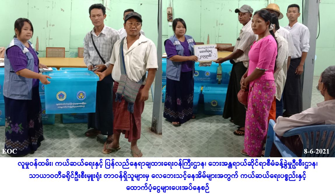 လူမှုဝန်ထမ်း၊ ကယ်ဆယ်ရေးနှင့်ပြန်လည်နေရာချထားရေးဝန်ကြီးဌာန၊ ဘေးအန္တရာယ် ဆိုင်ရာစီမံခန့်ခွဲမှုဦးစီးဌာန၊ ဆီဆိုင်မြို့နယ်ဦးစီးမှူးရုံးမှ တာဝန်ရှိသူများသည် (၄-၆-၂၀၂၁) ရက်နေ့၌ဆီဆိုင် မြို့နယ်၊ မြကန်သာရပ်ကွက်နှင့် (၅-၆-၂၀၂၁)ရက်နေ့၌ ဆီဆိုင်မြို့နယ်၊ ပင်စုံကျေးရွာအုပ်စု၊ ညောင်ကိုင်း ကျေးရွာတွင်မိုးကြိုးထိမှန်၍ သေဆုံးသူ(၂)ဦးအတွက် ထောက်ပံ့ငွေကျပ် (၆၀၀၀၀၀/-)နှင့် ဒဏ်ရာရသူ(၂)ဦး အတွက်ထောက်ပံ့ငွေကျပ်(၁၀၀၀၀၀/-) စုစုပေါင်း ထောက်ပံ့ ငွေကျပ် (၇၀၀၀၀၀/-)ကျပ်အား (၉-၆-၂၀၂၁)ရက်နေ့၊ နေ့လည်(၁၄းဝ၀) အချိန်တွင် ဆီဆိုင်မြို့နယ် အုပ်ချုပ်ရေးမှူးနှင့်အတူ ဘေးသင့်ပြည်သူများလက်ဝယ်အရောက် ထောက်ပံ့ပေးအပ်ခဲ့ပါကြောင်း သတင်းရရှိပါသည်။ Source: ဆီဆိုင်မြို့နယ်ဦးစီးမှူးရုံး (ဘစမ) #ha_tls #mon_jun2021
