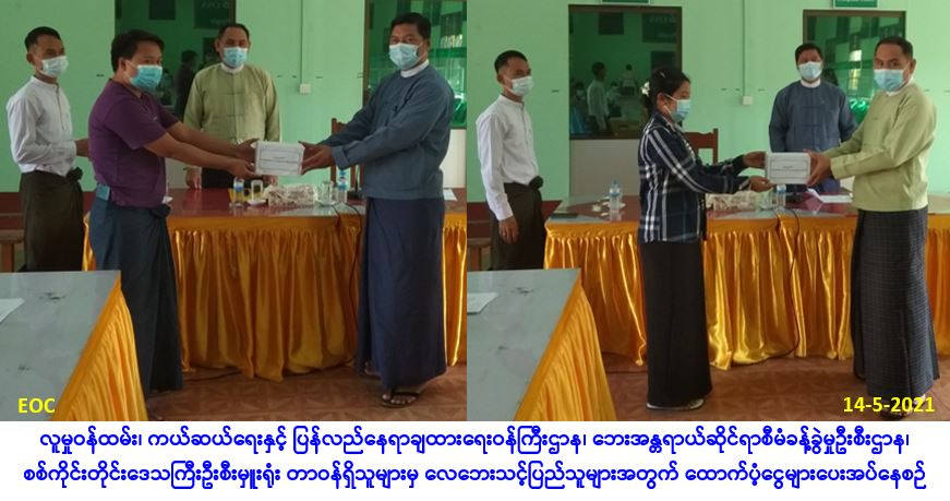 လူမှုဝန်ထမ်း၊ ကယ်ဆယ်ရေးနှင့် ပြန်လည်နေရာချထားရေးဝန်ကြီးဌာန၊ ဘေးအန္တရာယ်ဆိုင်ရာစီမံခန့်ခွဲမှုဦးစီးဌာန၊ မိုင်းဖြတ်မြို့နယ်ဦးစီးမှူးရုံးမှ တာဝန်ရှိသူများသည် ရှမ်းပြည်နယ်(အရှေ့ပိုင်း)၊ မိုင်းဖြတ်မြို့နယ်တွင် (၄ .၅ .၂၀၂၁)ရက်နေ့ နေ့လည်(၁၄ ၀၀)နာရီ အချိန်ခန့်တွင် မိုးသက်လေပြင်း တိုက်ခတ်မှုကြောင့် စျေးတန်းရပ်ကွက်အတွင်းရှိ အမိုးလန်နေအိမ် (၇)လုံးအတွက် အိမ်ဆောက်ပစ္စည်းဖိုး (၄၄၅၅၀၀ိ/-)ကျပ် နှင့် ဝမ်မိုင်ရပ်ကွက်အတွင်းရှိ အမိုးလန်နေအိမ် (၁၉)လုံး၊ ပြိုလဲနေအိမ်(၃)လုံးတို့အတွက် အိမ်ဆောက်ပစ္စည်းဖိုး (၁၅၃၃၉၀၀ိ/-) ကျပ် ၊ လူ(၁၄)ဦးအတွက် ဆန်ဖိုး(၂၉၄၀၀ိ/-)ကျပ်၊ ကယ်ဆယ်ရေးပစ္စည်း (၂၂)မျိုး (၃)အိမ်ထောင်စာ (ပစ္စည်း(၆)မျိုးအား ငွေသား (၁၉၆၀၀ိ/-) ကျပ်ဖြင့်ထောက်ပံ့) ၊ … Read more