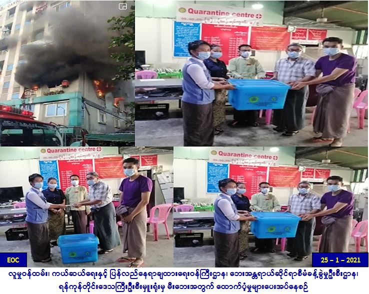လူမှုဝန်ထမ်း၊ ကယ်ဆယ်ရေးနှင့် ပြန်လည်နေရာချထားရေး ဝန်ကြီးဌာန၊ ဘေးအန္တရာယ်ဆိုင်ရာစီမံခန့်ခွဲမှုဦးစီးဌာန၊ ရန်ကုန် တိုင်းဒေသကြီးဦးစီးမှူးရုံးမှ တာဝန်ရှိသူများသည် ရန်ကုန်တိုင်း ဒေသကြီး၊ အရှေ့ပိုင်းခရိုင်၊ မြောက်ဥက္ကလာပမြို့နယ်၊ (ဆ) ရပ်ကွက်၊ ခေမာသီ(၃)လမ်းတွင် (၂၂-၁-၂၀၂၁)ရက်နေ့၊ (၁၇:၂၅)နာရီအချိန်၌ မီးလောင်မှုဖြစ်ပွားခဲ့ရာ နေအိမ်တိုက်ခန်း (၁)ခန်း မီးလောင်ဆုံးရှုံးခဲ့ပြီး၊ အိမ်ထောင်စု (၁)စုမှ လူဦးရေ (၇)ဦးတို့ မီးဘေးသင့်ခဲ့ပါသဖြင့်၊ အိမ်ဆောက်ပစ္စည်းဖိုးထောက်ပံ့ငွေကျပ် (၂၀၀,၀၀၀/-)၊ လူဦးရေ (၇)ဦးအတွက် ဆန်ရိက္ခာဖိုးထောက်ပံ့ငွေကျပ် (၁၄,၇၀၀/-)နှင့် ကယ်ဆယ်ရေးပစ္စည်း (၁၆)မျိုး (၁) အိမ်ထောင်စုစာတို့အား အထွေထွေအုပ်ချုပ်ရေးဦးစီးဌာနမှ တာဝန်ရှိသူများနှင့်အတူ ဘေးသင့်ပြည်သူများထံသို့ (၂၅-၁-၂၀၂၁) … Read more