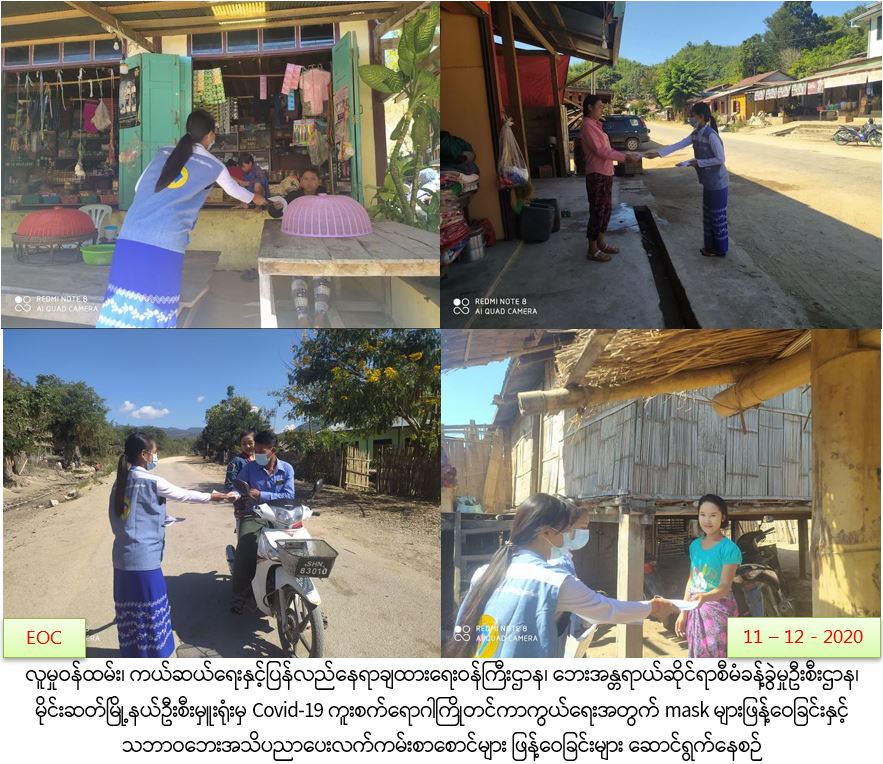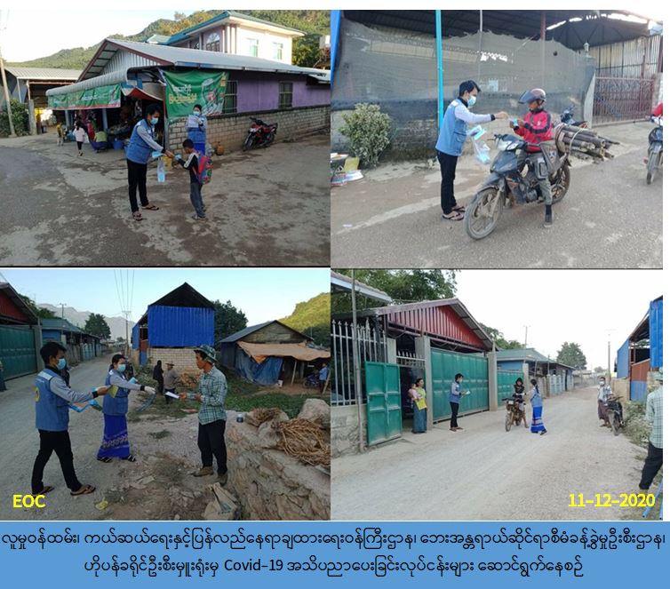 လူမှုဝန်ထမ်း၊ ကယ်ဆယ်ရေးနှင့်ပြန်လည်နေရာချထားရေးဝန်ကြီးဌာန၊ ဘေးအန္တရာယ်ဆိုင်ရာ စီမံခန့်ခွဲမှုဦးစီးဌာန၊ ဟိုပန်ခရိုင်ဦးစီးမှူးရုံးမှ တာဝန်ရှိသူများသည် (၁၁-၁၂-၂၀၂၀) ရက်နေ့တွင် ဟိုပန်မြို့နယ်၊ မော်ဟွေ့ကျေးရွာနှင့် ဟင်းနားကျေးရွာတို့၌ Covid-19 ဒုတိယလှိုင်းကာလ အတွင်း ပြည်သူများ လိုက်နာရမည့်ကျန်းမာရေးအမူအကျင့်များ အသိပညာပေးခြင်းနှင့် သဘာဝ ဘေးဆိုင်ရာအသိပညာပေးခြင်း၊ နှာခေါင်းစည်း (Masks) နှင့် အသိပညာပေး လက်ကမ်းစာစောင်များ ဖြန့်ပေးဝေခြင်းတို့အား ဆောင်ရွက်ခဲ့ပါကြောင်း သတင်းရရှိပါသည်။ #ar #shn_dec2020 Source: ဟိုပန်ခရိုင်ဦးစီးမှူးရုံး (ဘစမ)