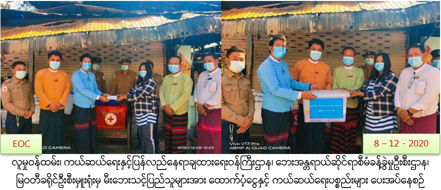 လူမှုဝန်ထမ်း၊ ကယ်ဆယ်ရေးနှင့်ပြန်လည်နေရာချထားရေးဝန်ကြီးဌာန၊ ဘေးအန္တရာယ်ဆိုင်ရာစီမံခန့်ခွဲမှုဦးစီးဌာန၊ မြဝတီခရိုင်ဦးစီးမှူးရုံးမှ ကရင်ပြည်နယ်၊ မြဝတီမြို့နယ်၊ အမှတ်(၄)ရပ်ကွက်၊ မေတ္တာ(၃)လမ်းတွင်(၇.၁၂.၂၀၂၀)ရက်နေ့ (၂၂း၀၀)နာရီချိန်၌ မီးအားမြှင့်စက်အပူလွန်ကဲရာမှတဆင့် မီးလောင်ကျွမ်းမှုကြောင့် လူနေအိမ်(၁)လုံး အိမ်ထောင်စု(၁)စုမှ လူဦးရေ(၃)ဦးတို့ မီးဘေးဒဏ်သင့်ခဲ့ပါသဖြင့် အိမ်ဆောက်ပစ္စည်းဖိုးထောက်ပံ့ငွေကျပ်(၂၀၀၀၀ဝိ/-)၊ ဆန်ရိက္ခာ(၇)စာဖိုးထောက်ပံ့ငွေကျပ်(၆၃၀ဝိ/-)၊ ဒဏ်ရာရရှိသူ (၂)ဦးအတွက် (၁၀၀၀၀ဝိ/-)၊ စုစုပေါင်းထောက်ပံ့ငွေကျပ်(၃၀၆၃၀ဝိ/-)အား မြဝတီမြို့ပြည်သူ့လွှတ်တော်ကိုယ်စားလှယ်၊ အထွေထွေအုပ်ချုပ်ရေးဦးစီးဌာန၊ ဒုမြို့နယ်အုပ်ချုပ်ရေးမှူး၊ မြဝတီမြို့ကြက်ခြေနီအသင်းတို့နှင့်အတူ (၈-၁၂-၂၀၂၀)ရက်နေ့ (၁၂း၃၀)နာရီအချိန်တွင် ဘေးသင့်ပြည်သူများထံသို့ ထောက်ပံ့ပေးခဲ့ကြောင်း သတင်းရရှိပါသည်။ #ha_fir #krn_dec2020 Source: မြဝတီခရိုင်ဦးစီးမှူးရုံး (ဘစမ)