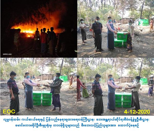 လူမှုဝန်ထမ်း၊ ကယ်ဆယ်ရေးနှင့် ပြန်လည်နေရာချထားရေးဝန်ကြီးဌာန၊ ဘေးအန္တရာယ်ဆိုင်ရာစီမံခန့်ခွဲမှုဦးစီးဌာန၊ မောင်တောခရိုင်ဦးစီးမှူးရုံးမှတာဝန်ရှိသူများသည် (၄-၁၂-၂၀၂၀)ရက် (၂၁:၂၀)နာရီခန့်တွင်မောင်တောမြို့၊ ရွှေဇားအုပ်စု၊ ရွှေဇားကပ္ပကောင်းကျေးရွာတွင် အာဆူမာ(ဘ)အူလာမျှာ၏နေအိမ်မှ မီးလောင်မှုဖြစ်ပွားခဲ့ရာ (၁၂ပေ ၁၅ပေ ၈ပေ)မြေစိုက်လူနေအိမ်(၄)လုံး မီးလောင်ဆုံရှုံးခဲ့ပြီး အဆိုပါမီးဘေးကြောင့်(၄)စုမှ လူဦးရေ(၂၄)ဦးတို့ မီးဘေးသင့်ခဲ့ရပြီးအဆိုပါ မီးဘေးသင့် အိမ်ထောင်စု(၄)စုအား ကယ်ဆယ်ရေးပစ္စည်း(၁၆)မျိုး၊ အထစ(၄)စုစာ လူ(၂၄)ဦးအတွက်ဆန်(၇)ရက်စာဖိုးထောက်ပံငွေ(၅၀,၄၀ဝိ/-)၊ လူနေအိမ်(၁)လုံးအတွက် အိမ်ဆောက်ပစ္စည်းဖိုးထောက်ပံ့ငွေ(၁၀၀၀၀ဝိ/-)နှုန်းဖြင့် လူနေအိမ်(၄)လုံးအတွက်ထောက်ပံ့ငွေ(၄၀၀,၀၀၀/-)ကျပ်အား (၆-၁၂-၂၀၂၀)နေ့တွင် ဘေးသင့်ပြည်သူများထံ သွားရောက်ထောက်ပံ့ခဲ့ကြောင်း သတင်းရရှိပါသည်။ Source: မောင်တောခရိုင်ဦးစီးမှူးရုံး #ha_fir #rke_dec2020