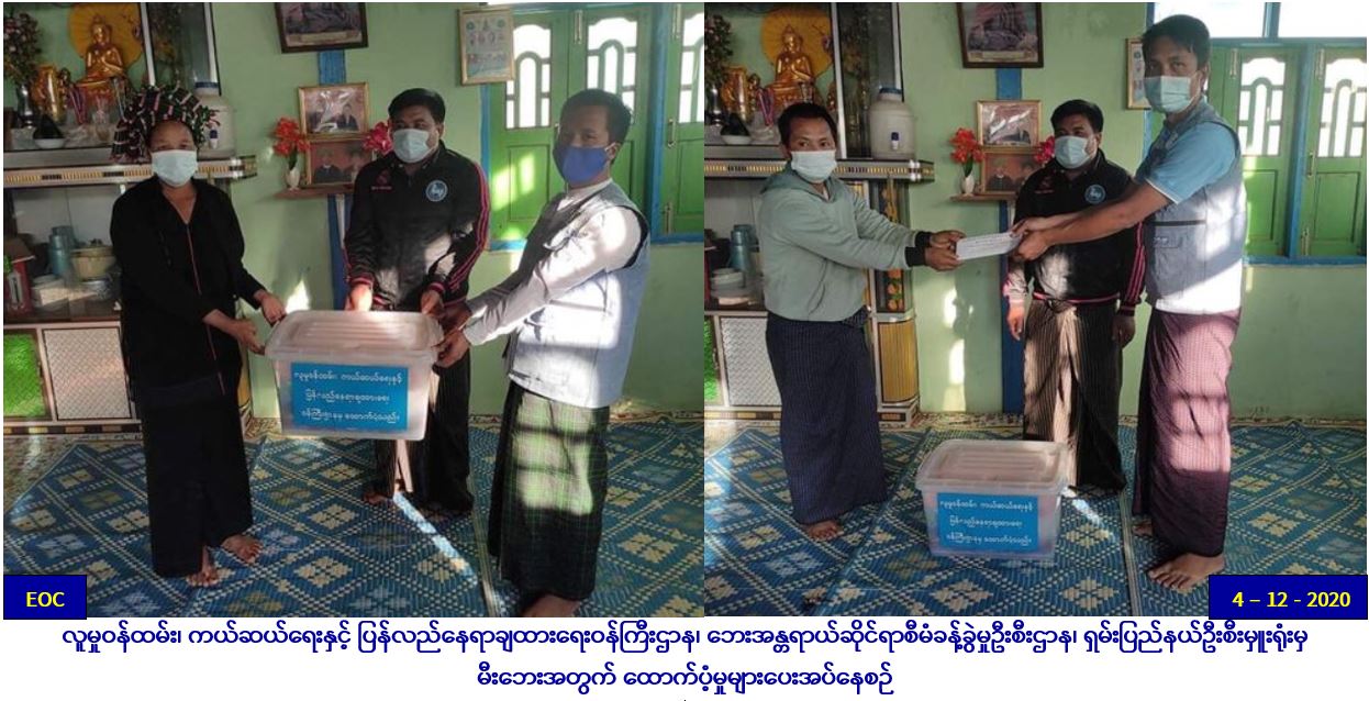 လူမှုဝန်ထမ်း၊ ကယ်ဆယ်ရေးနှင့် ပြန်လည်နေရာချထားရေးဝန်ကြီးဌာန၊ ဘေးန္တရာယ်ဆိုင်ရာစီမံခန့်ခွဲမှုဦးစီးဌာန၊ ရှမ်းပြည်နယ် ဦးစီးမှူးရုံးမှ တာဝန်ရှိသူများသည် (၂.၁၂.၂၀၂၀) ရက်နေ့တွင် ညောင်ရွှေမြို့နယ် ကျေးပေါခုံကျေးရွာအုပ်စု၊ ကျားတွန်ကျေးရွာ တွင် ဖြစ်ပွားခဲ့သည့် မီးဘေးကြောင့် ဘေးသင့်အိမ်ခြေ (၄)လုံးအတွက် အိမ်ဆောက်ပစ္စည်းဖိုး (၄၀၀၀၀၀/-) ကျပ် လူဦးရေ(၂၁)ဦး အတွက် ဆန်ရိက္ခာဖိုး (၇)စာထောက်ပံ့ငွေကျပ် (၄၄၁၀၀/-) ကျပ်၊ စုစုပေါင်းထောက်ပံ့ငွေကျပ် (၄၄၄၁၀၀/-) ကျပ်နှင့် အိမ်ထေင်စု (၄) စုအတွက် ကယ်ဆယ်ရေးပစ္စည်း (၂၂)မျိုး (၄)အိမ်ထောင်စုစာအား(၄-၁၂-၂၀၂၀)ရက်နေ့တွင် မီးဘေးသင့်ပြည်သူ များ လက်ဝယ်အရောက် သွားရောက်ထောက်ပံ့ပေးခဲ့ပါကြောင်း သတင်းရရှိပါသည်။ … Read more