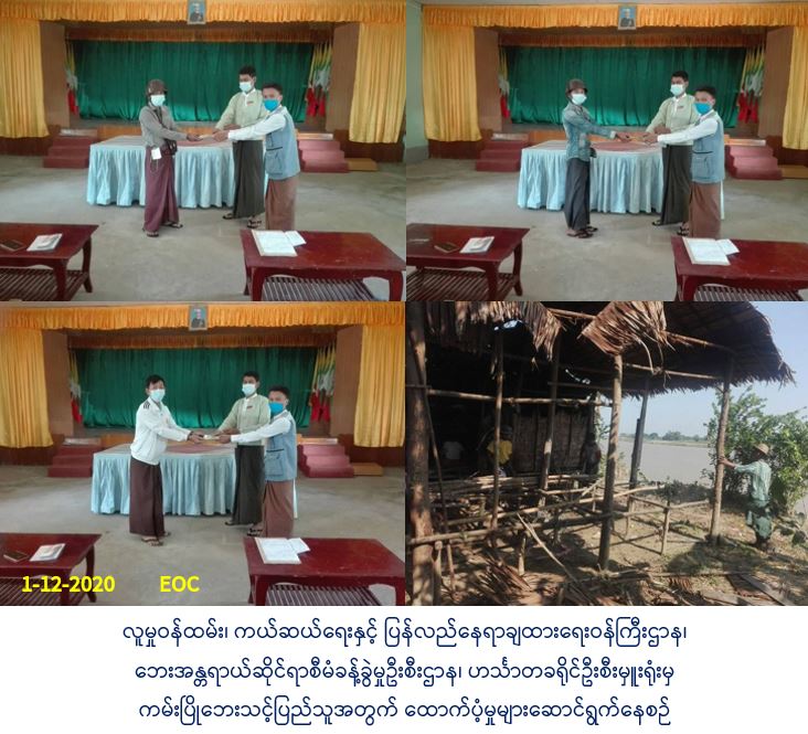 လူမှုဝန်ထမ်း၊ ကယ်ဆယ်ရေးနှင့် ပြန်လည်နေရာချထားရေးဝန်ကြီးဌာန၊ ဘေးအန္တရာယ်ဆိုင်ရာစီမံခန့်ခွဲမှုဦးစီးဌာန၊ ဟင်္သာတခရိုင်ဦးစီးမှူးရုံးမှ တာဝန်ရှိသူများသည် (၂၆-၁၁-၂၀၂၀)ရက်နေ့၌ ဟင်္သာတခရိုင်၊ လေးမျက်နှာမြို့နယ်၊ သောင်ဘုတ် အုပ်စု၊ (သောင်ဘုတ်၊ အလယ်ကျွန်း) ကျေးရွာတွင် ဖြစ်ပွားခဲ့သော ကမ်းပြိုဘေးကြောင့် ကြိုတင်ပြောင်းရွှေ့ခဲ့ရသော အိမ်ခြေ(၆)လုံးအတွက် အိမ်ဆောက်ပစ္စည်းဖိုးထောက်ပံ့ငွေ (၆၀၀၀၀ဝ/-)ကျပ်နှင့် လူဦးရေ(၂၂)ဦးအတွက် ဆန်ရိက္ခာ(၇)ရက်စာ ဖိုးထောက်ပံ့ငွေ (၄၆၂၀ဝ/-)ကျပ် စုစုပေါင်းကယ်ဆယ်ရေးရန်ပုံငွေ (၆၄၆၂၀ဝ/-)ကျပ်တို့ကို (၁-၁၂-၂၀၂၀)ရက်နေ့ (၁၂:၀၀) နာရီအချိန်တွင် လေးမျက်နှာမြို့နယ်၊ အထွေထွေအုပ်ချုပ်ရေးဦးစီးဌာန၌ သက်ဆိုင်ရာတာဝန်ရှိသူများနှင့်အတူ ဘေးသင့်ပြည်သူများလက်ဝယ်သို့အရောက် ထောက်ပံ့ပေးအပ်ခဲ့ပါကြောင်း သတင်းရရှိပါသည်။ Source: ဟင်္သာတခရိုင်ဦးစီးမှူးရုံး (ဘစမ) #ha_rbe #ayy_dec2020