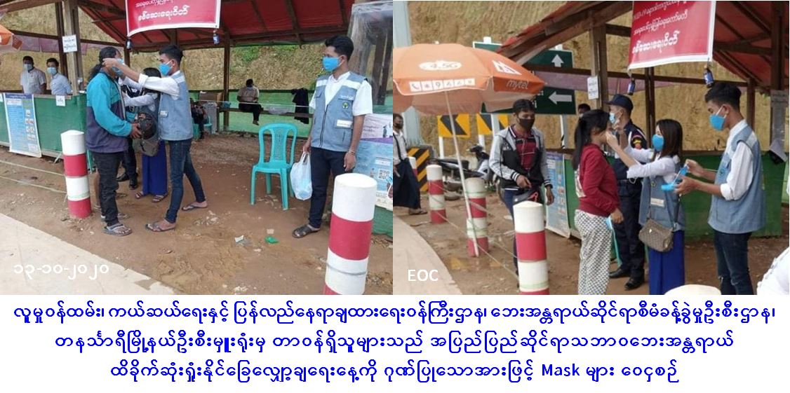 လူမှုဝန်ထမ်း၊ ကယ်ဆယ်ရေးနှင့် ပြန်လည်နေရာချထားရေးဝန်ကြီးဌာန၊ ဘေးအန္တရာယ်ဆိုင်ရာစီမံခန့်ခွဲမှုဦးစီးဌာန၊ တနင်္သာရီမြို့နယ်ဦးစီးမှူးရုံးမှ တာဝန်ရှိသူများသည် ဌာနဆိုင်ရာများမှ တာဝန်ရှိသူများနှင့်အတူ (၁၃-၁၀-၂၀၂၀) ရက်နေ့တွင် တနင်္သာရီမြို့နယ်ရှိ မြို့အဝင်စစ်ဆေးရေးဂိတ်၌ အပြည်ပြည်ဆိုင်ရာသဘာဝဘေးအန္တရာယ်ထိခိုက်ဆုံးရှုံးနိုင်ခြေလျှော့ချရေးနေ့ကို ဂုဏ်ပြုသောအားဖြင့် ဦးစီးဌာန Logo ပါ Mask များကို ဝေငှပေးခဲ့ကြောင်း သတင်းရရှိပါသည်။ #otr #tny_oct2020 Source: တနင်္သာရီမြို့နယ်ဦးစီးမှူးရုံး (ဘစမ)