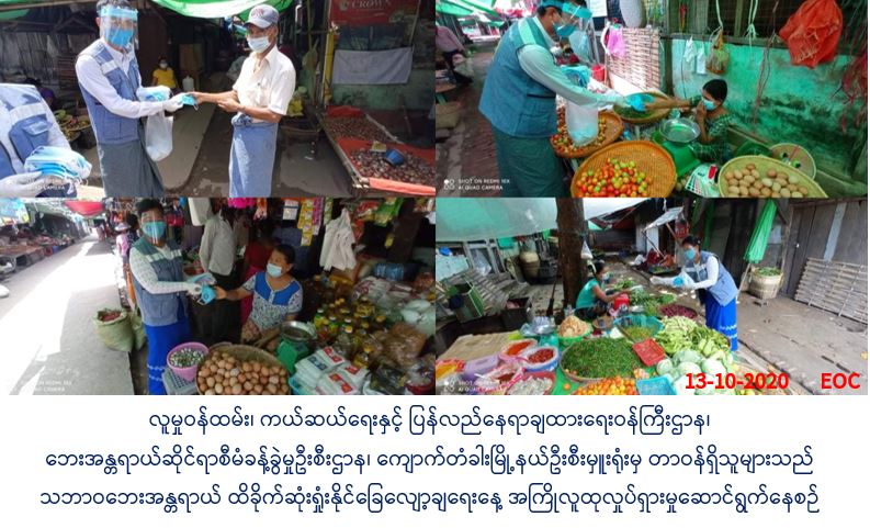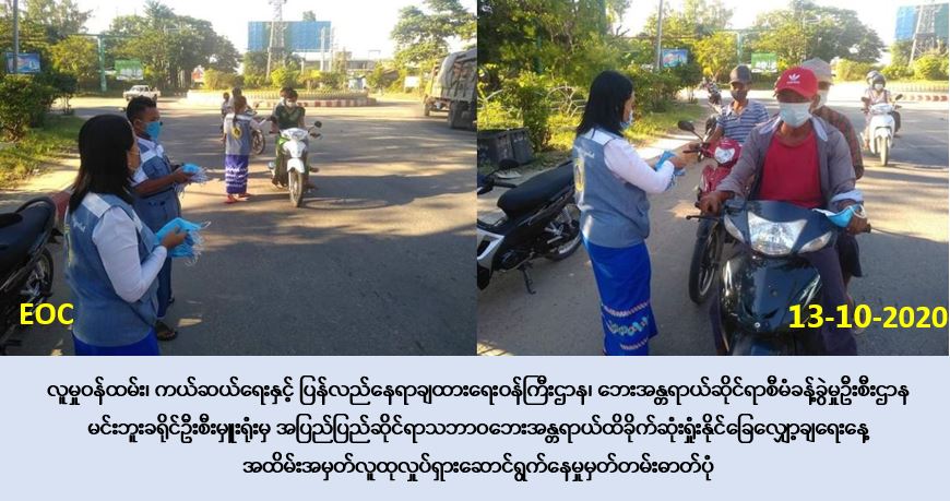 လူမှုဝန်ထမ်း၊ ကယ်ဆယ်ရေးနှင့် ပြန်လည်နေရာချထားရေးဝန်ကြီးဌာန၊ ဘေးအန္တရာယ်ဆိုင်ရာစီမံခန့်ခွဲမှုဦးစီးဌာန၊ တောင်ငူခရိုင်ဦးစီးမှူးရုံးမှ တာဝန်ရှိသူများသည် (၁၃-၁၀-၂၀၂၀)ရက်နေ့တွင် ကျရောက်သည့် “အပြည်ပြည်ဆိုင်ရာ သဘာဝဘေး အန္တရာယ်ထိခိုက်ဆုံးရှုံးနိုင်ခြေလျှော့ချရေးနေ့”ကို ဂုဏ်ပြုသောအားဖြင့် IDDRR Logo ပါ Mask (၂၀၀)ခုနှင့် Surgical Mask (၁၀၀၀)ခုတို့ကို မြို့နယ်ယာဉ်ထိန်းရဲတပ်ဖွဲ့၊ စွမ်းအားသစ် ကျန်းမာရေးစောင့်ရှောက်မှုအသင်းတို့နှင့်ပူးပေါင်း၍ ပြည်သူများအား ဝေငှခဲ့ကြောင်း သတင်းရရှိပါသည်။ #otr #bgo_oct2020 Source: တောင်ငူခရိုင်ဦးစီးမှူးရုံး (ဘစမ)