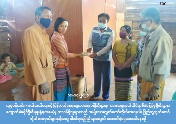 လူမှုဝန်ထမ်း၊ ကယ်ဆယ်ရေးနှင့် ပြန်လည်နေရာချထားရေး ဝန်ကြီးဌာန၊ ဘေးအန္တရာယ်ဆိုင်ရာ စီမံခန့်ခွဲမှု ဦးစီးဌာန၊ မိုးညိုမြို့နယ်ဦးစီးမှူးရုံးမှ တာဝန်ရှိသူများသည် (၁၀-၁၀-၂၀၂၀)ရက်နေ့၌ ပဲခူးတိုင်းဒေသကြီး၊ သာယာဝတီခရိုင်၊ မိုးညိုမြို့နယ်၊ ကျေးရွာအုပ်စု (၂)အုပ်စု၊ကျေးရွာ (၂)ရွာတို့တွင် ဖြစ်ပွားခဲ့သော လေဘေးကြောင့် ပြိုလဲနေအိမ်(၁)လုံးနှင့် တစ်စိတ်တစ်ပိုင်းပျက်စီးနေအိမ် (၁)လုံးအတွက် အိမ်ဆောက် ပစ္စည်းဖိုးထောက်ပံ့ငွေ (၁၃၀,၀၀၀)ကျပ်၊ အိမ်ထောင်စု(၂)စုရှိ လူဦးရေ(၁၀)ဦးတို့အတွက် ဆန်ရိက္ခါ(၇) ရက်စာဖိုးထောက်ပံ့ငွေ (၂၁,၀၀၀)ကျပ်၊ စုစုပေါင်းထောက်ပံ့ငွေ(၁၅၁,၀၀၀)ကျပ်နှင့် ကယ်ဆယ်ရေး ပစ္စည်း (၁၆) မျိုး(၁)အိမ်ထောင်စာတို့ကို (၁၂-၁၀-၂၀၂၀)ရက်နေ့ (၁၁:၀၀)နာရီအချိန်တွင် ဘေးသင့် နေအိမ်များ၌ မြို့နယ်အထွေထွေအုပ်ချုပ်ရေးဦးစီးဌာနမှ … Read more