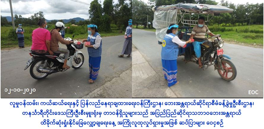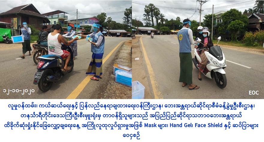 လူမှုဝန်ထမ်း၊ ကယ်ဆယ်ရေးနှင့် ပြန်လည်နေရာချထားရေးဝန်ကြီးဌာန၊ ဘေးအန္တရာယ်ဆိုင်ရာစီမံခန့်ခွဲမှုဦးစီးဌာန၊ တနင်္သာရီတိုင်းဒေသကြီးဦးစီးမှူးရုံးမှ တာဝန်ရှိသူများသည် (၁၂-၁၀-၂၀၂၀) ရက်နေ့တွင် ရေဖြူမြို့နယ်ရှိ ရပ်ကွက်များနှင့် ရေဖြူဈေးများ၌ အပြည်ပြည်ဆိုင်ရာ သဘာဝဘေးအန္တရာယ်ထိခိုက်ဆုံးရှုံးနိုင်ခြေလျှော့ချရေးနေ့ကို ဂုဏ်ပြုသောအားဖြင့် အကြိုလူထုလှုပ်ရှားမှု ဆောင်ရွက်ရာ ဦးစီးဌာန Logo ပါ Mask များ၊ အဖွဲ့အစည်းများမှ လှူဒါန်းသည့် Hand Gel၊ Face Shield နှင့် ဆပ်ပြာများကို ဝေငှခဲ့ကြောင်း သတင်းရရှိပါသည်။ #otr #tny_oct2020 Source: တနင်္သာရီတိုင်းဒေသကြီးဦးစီးမှူးရုံး (ဘစမ)