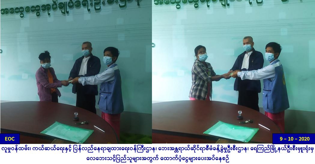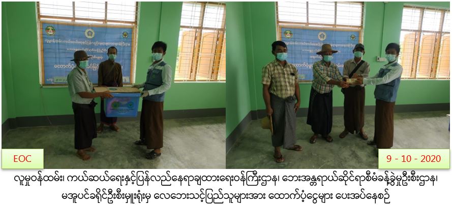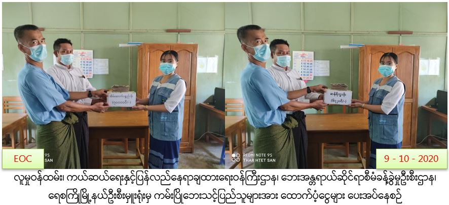 လူမှုဝန်ထမ်း၊ ကယ်ဆယ်ရေးနှင့်ပြန်လည်နေရာချထားရေးဝန်ကြီးဌာန၊ ဘေးအန္တရာယ်ဆိုင်ရာစီမံခန့်ခွဲမှုဦးစီးဌာန၊ မအူပင်ခရိုင်ဦးစီးမှူးရုံးမှ တာဝန်ရှိသူများသည် ဧရာဝတီတိုင်းဒေသကြီး၊ မအူပင်ခရိုင်၊ မအူပင်မြို့နယ်၊ ကံကုန်းကျေးရွာအုပ်စု၊ ကံစုကျေးရွာ၊ မြဦးအိုင်ကျေးရွာနှင့် ကဝက္ကင်းကျေးရွာအုပ်စု၊ စာဖြူစုကျေးရွာတို့၌ (၈-၁၀၂၀၂၀)ရက်နေ့တွင် ဖြစ်ပွားခဲ့သော လေဘေးကြောင့် ပြိုကျပျက်စီးခဲ့သည့်နေအိမ်(၂)လုံး၊ အမိုးလန်ပျက်စီးခဲ့သည့် နေအိမ်(၂)လုံး၊ စုစုပေါင်း နေအိမ်(၄)လုံး၊ အိမ်ထောင်စု(၄)စုမှ လူဦးရေ(၁၂)ဦးတို့အတွက် ကယ်ဆယ်ရေးပစ္စည်း(၁၇)မျိုးပါ (၂)ပုံးနှင့် အိမ်ဆောက်ပစ္စည်းဖိုးရန်ပုံငွေ(၃၀၀၀၀ဝိ/-)၊ ဆန်ရိက္ခာ(၇)ရက်စာ ရန်ပုံငွေ(၂၅၂၀ဝိ/-)၊ စုစုပေါင်းကယ်ဆယ်ရေးရန်ပုံငွေ(၃၂၅၂၀ဝိ/-)တို့အား (၉-၁၀-၂၀၂၀)ရက်နေ့၊ (၁၄:၀၀)နာရီအချိန်တွင် လေဘေးသင့်ပြည်သူများလက်ဝယ်အရောက် ထောက်ပံ့ပေးအပ်ခဲ့ကြောင်း သတင်းရရှိပါသည်။ #ha_sgw #ayy_oct2020 Source: မအူပင်ခရိုင်ဦးစီးမှူးရုံး (ဘစမ)