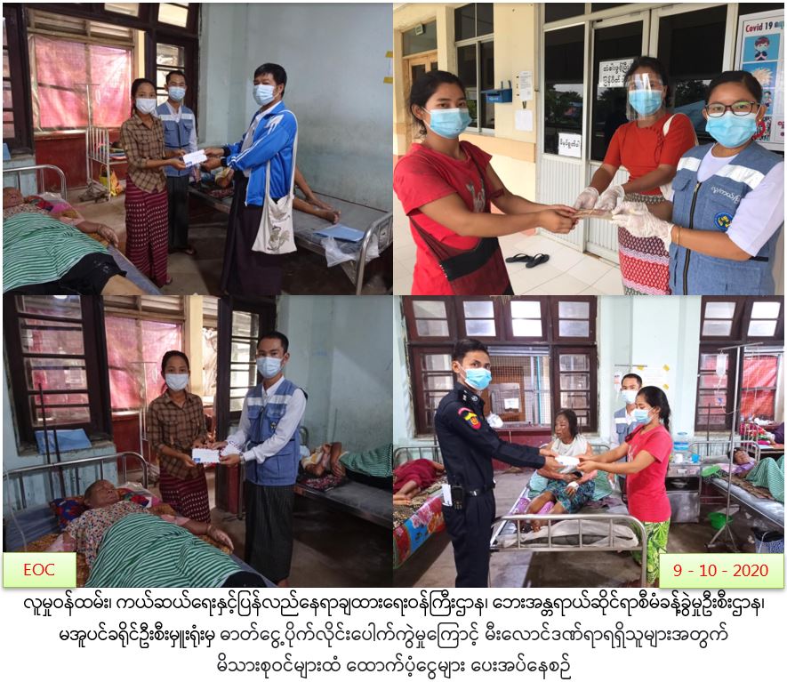 လူမှုဝန်ထမ်း၊ ကယ်ဆယ်ရေးနှင့်ပြန်လည်နေရာချထားရေးဝန်ကြီးဌာန၊ ဘေးအန္တရာယ်ဆိုင်ရာစီမံခန့်ခွဲမှုဦးစီးဌာန၊ ညောင်တုန်းမြို့နယ်ဦးစီးမှူးရုံးမှ တာဝန်ရှိသူများသည် (၉.၁၀.၂၀၂၀)ရက်နေ့ (၀၃း၂၀)နာရီအချိန်တွင် ညောင်တုန်းမြို့နယ်၊ ကညင်ကောက်ကြီးကျေးရွာ အုပ်စု၊ ရွာသစ်ကုန်းကျေးရွာ ရန်ကုန်-ပုသိမ်ကားလမ်းမဘေးရှိ ညောင်တုန်းမြို့၊ အမှတ်(၂)ရေနံနှင့်သဘာဝဓာတ်ငွေ့စက်ရုံမှ ညောင်တုန်း-ကန်ကြီးထောင့် သွယ်တန်းထားသော ဓာတ်ငွေ့ပိုက်လိုင်း ပေါက်ကွဲမှုကြောင့် မီးလောင်ဒဏ်ရာရရှိခဲ့သည့် (၁၀)ဦးအနက် ညောင်တုန်းမြို့ပြည်သူ့ဆေးရုံကြီး၌ ဆေးကုသမှုခံယူနေသူ (၇)ဦးအား တိုင်းဒေသကြီးလွှတ်တော်ကိုယ်စားလှယ် ဦးကျော်ဆန်း၊ ဒုတိယမြို့နယ်အုပ်ချုပ်ရေးမှူး၊ မီးသတ်ဦးစီးမှူးတို့နှင့်အတူ တစ်ဦးလျှင် ထောက်ပံ့ငွေ (၅၀၀၀ဝိ/-)နှုန်းဖြင့် ထောက်ပံ့ငွေ (၃၅၀၀၀၀ိ/-)အား (၉.၁၀.၂၀၂၀)ရက်နေ့ (၁၀း၀၀)နာရီအချိန်၌လည်းကောင်း၊ မအူပင်မြို့နယ် ပြည်သူ့ဆေးရုံကြီး၌ ဆေးကုသမှုခံယူနေသူ (၃)ဦးအား အမျိုးသားလွှတ်တော်ကိုယ်စားလှယ် ဒေါ်အိအိပြုံးနှင့်အတူ … Read more