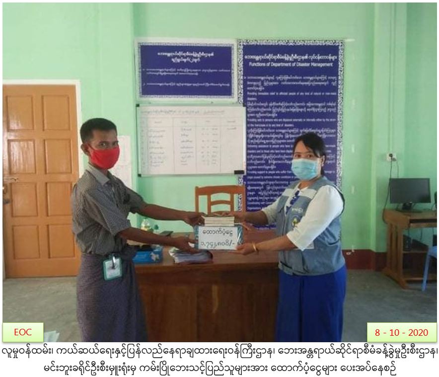 လူမှုဝန်ထမ်း၊ ကယ်ဆယ်ရေးနှင့်ပြန်လည်နေရာချထားရေးဝန်ကြီးဌာန၊ ဘေးအန္တရာယ်ဆိုင်ရာစီမံခန့်ခွဲမှုဦးစီးဌာန၊ မင်းဘူးခရိုင်ဦးစီးမှူးရုံးမှ တာဝန်ရှိသူများသည် မင်းဘူးခရိုင်၊ မင်းဘူး(စကု)မြို့နယ်၊ ကျောင်းကုန်းကျေးရွာတွင် (၂၆-၉-၂၀၂၀)ရက်နေ့၌ ဖြစ်ပွားခဲ့သော ဧရာဝတီမြစ်ရေတိုက်စား၍ ကမ်းပါးပြိုကျမည်ကို စိုးရိမ်မှုကြောင့် ကြိုတင်ပြောင်းရွှေ့အိမ်ခြေ(၁၆)လုံး၊ အိမ်ထောင်စု(၁၆)စုတို့အတွက် အိမ်ဆောက်ပစ္စည်းဖိုး(၁,၆၀၀,၀၀၀ိ/-)၊ လူဦးရေ(၆၈)ဦးအတွက် ဆန်ရိက္ခါ(၇)ရက်စာ (၁၄၂,၈၀၀ိ/-)ကျပ်၊ စုစုပေါင်းထောက်ပံ့ငွေ(၁,၇၄၂,၈၀၀ိ/-)အား (၈-၁၀-၂၀၂၀)ရက်နေ့၊ (၁၅:၀၀)အချိန်တွင် ကျေးရွာအုပ်စုအုပ်ချုပ်ရေးမှူးထံသို့ လွှဲပြောင်းထောက်ပံ့ပေးအပ်ခဲ့ကြောင်း သတင်းရရှိပါသည်။ #ha_rbe #mgy_oct2020 Source: မင်းဘူးခရိုင်ဦးစီးမှူးရုံး (ဘစမ)
