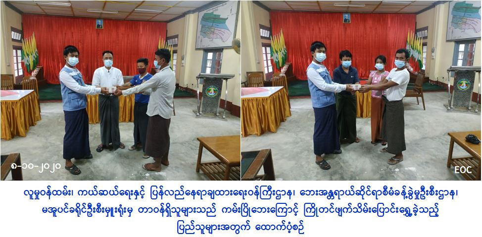 လူမှုဝန်ထမ်း၊ ကယ်ဆယ်ရေးနှင့် ပြန်လည်နေရာချထားရေးဝန်ကြီးဌာန၊ ဘေးအန္တရာယ်ဆိုင်ရာစီမံခန့်ခွဲမှုဦးစီးဌာန၊ မအူပင်ခရိုင်ဦးစီးမှူးရုံးမှ တာဝန်ရှိသူများသည် မအူပင်ခရိုင်၊ ပန်တနော်မြို့နယ်၊ ကဿဝင်ကျေးရွာအုပ်စု ကဿဝင်ရွာမကျေးရွာနှင့် ပြည်တော်သာကျေးရွာ၊ တောကျောင်းကျေးရွာအုပ်စု မင်းသားကျွန်းကျေးရွာတို့၌ (၇-၁၀-၂၀၂၀) ရက်နေ့နှင့် (၈-၁၀-၂၀၂၀) ရက်နေ့တို့တွင် ဖြစ်ပွားခဲ့သော ကမ်းပြိုဘေးကြောင့် ကြိုတင်ဖျက်သိမ်းပြောင်းရွှေ့ခဲ့သည့် နေအိမ်(၁၁)လုံး၊ အိမ်ထောင်စု(၁၁)စုမှ လူဦးရေ(၃၈)ဦးအတွက် အိမ်ဆောက်ပစ္စည်းဖိုးရန်ပုံငွေ(၁၁၀၀၀၀၀/-) ကျပ်၊ ဆန်ရိက္ခာ(၇)ရက်စာဖိုး ရန်ပုံငွေ(၇၉၈၀၀/-)ကျပ်၊ စုစုပေါင်းကယ်ဆယ်ရေးရန်ပုံငွေ(၁၁၇၉၈၀၀/-) ကျပ်တိတိအား (၈-၁၀-၂၀၂၀) ရက်နေ့၊ (၁၃:၃၀) နာရီအချိန်တွင် မြို့နယ်အထွေထွေအုပ်ချုပ်ရေးဦးစီးဌာနမှ တာဝန်ရှိသူများ၊ ကျေးရွာအုပ်ချုပ်ရေးမှူး၊ ရပ်မိရပ်ဖများရှေ့မှောက်၌ ဘေးသင့်ပြည်သူများ လက်ဝယ်အရောက် ထောက်ပံ့ပေးအပ်ခဲ့ကြောင်း … Read more