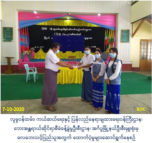 လူမှုဝန်ထမ်း၊ ကယ်ဆယ်ရေးနှင့် ပြန်လည်နေရာချထားရေးဝန်ကြီးဌာန၊ ဘေးအန္တရာယ်ဆိုင်ရာစီမံခန့်ခွဲမှုဦးစီးဌာန၊ ဗန်းမော်ခရိုင်ဦးစီးမှူးရုံးမှ တာဝန်ရှိသူများသည် (၇-၁၀-၂၀၂၀) ရက်နေ့၊ နံနက် (၁၅:၀၀) နာရီအချိန်တွင် လွယ်ဂျယ်မြို့ရှိ လီဆူ Idps စခန်းတွင် အိမ်ထောင်စု (၂၁၁)စု၊ လူဦးရေ (၁၂၁၅)ဦး၊ နှစ်ခြင်း IDPs စခန်းတွင် အိမ်ထောင်စု(၃၈)စု၊ လူဦးရေ(၂၄၁)ဦး၊ RC Idps စခန်းတွင် အိမ်ထောင်စု(၆၇)စု ၊လူဦးရေ(၄၁၈)ဦး၊ ဆိုင်းဂျာ Idps စခန်းတွင် အိမ်ထောင်စု(၄၄)စု၊ လူဦးရေ(၂၇၄)ဦး၊ ညောင်နှစ်ပင် Idps စခန်းတွင် အိမ်ထောင်စု (၄၈)စု၊ လူဦးရေ … Read more