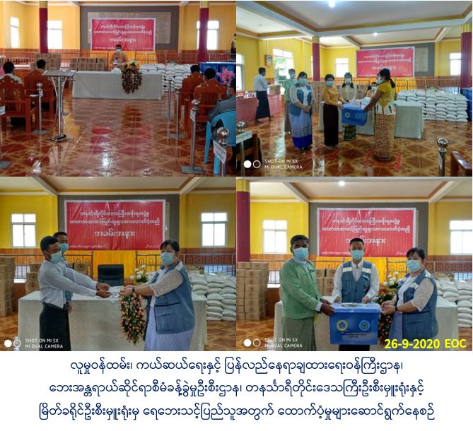 လူမှုဝန်ထမ်း၊ ကယ်ဆယ်ရေးနှင့် ပြန်လည်နေရာချထားရေးဝန်ကြီးဌာန၊ ဘေးအန္တရာယ်ဆိုင်ရာစီမံခန့်ခွဲမှုဦးစီးဌာန၊ ရခိုင်ပြည်နယ်ဦးစီးမှူးရုံးမှ တာဝန်ရှိသူများသည် COVID-19 Economic Relief Plan(CERP)အစီအစဉ်ဖြင့် ရခိုင်ပြည်နယ်တွင် တိုက်ပွဲရှောင်စုရပ်များနှင့် IDP စခန်းများရှိ အိမ်ထောင်စု(၁)စုလျှင် (၄၀၀၀ဝိ/-) (ကျပ်လေးသောင်း)နှုန်းဖြင့် ထောက်ပံ့လျက်ရှိရာ စစ်တွေမြို့နယ်၊ တပဦးကျောင်း၊ သောဘိရာမကျောင်း၊ လရောင်ဝန်းကျောင်း၊ ဃောသိတာရုံကျောင်း၊ တေဇာရာမကျောင်း၊ မဟာဇေယျသိဒ္ဓိပဌာန်းကျောင်း၊ ဥဿလင်းကျောင်း၊ မေယုရတနာကျောင်း၊ မေယုဓမ္မစက္ခုကျောင်းနှင့် ဝိဘဇ္ဇဝါဒီကျောင်းတို့တွင် ရောက်ရှိခိုလှုံလျက်ရှိသော အိမ်ထောင်စု (၄၄၃)စုအတွက် ထောက်ပံ့ငွေ စုစုပေါင်း (၁၇,၇၂၀,၀၀ဝိ/-) (ကျပ်တစ်ရာခုနစ်ဆယ့်ခုနစ်သိန်းနှစ်သောင်းတိတိ)ကို (၂၆-၉-၂၀၂၀)ရက်နေ့တွင် ထောက်ပံ့ပေးအပ်ခဲ့ကြောင်း သတင်းရရှိပါသည်။ #otr … Read more