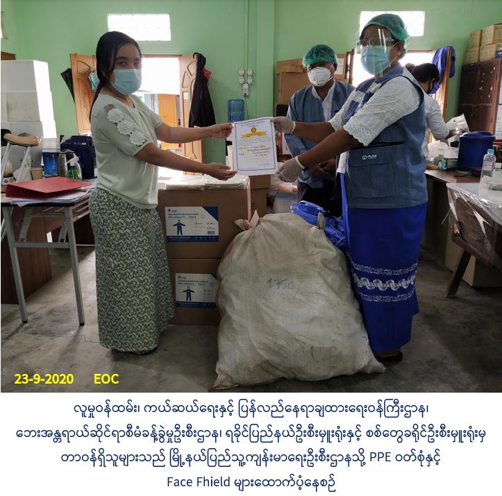 လူမှုဝန်ထမ်း၊ ကယ်ဆယ်ရေးနှင့် ပြန်လည်နေရာချထားရေးဝန်ကြီးဌာန၊ ဘေးအန္တရာယ်ဆိုင်ရာစီမံခန့်ခွဲမှုဦးစီးဌာန၊ ရခိုင်ပြည်နယ်ဦးစီးမှူးရုံးနှင့် စစ်တွေခရိုင်ဦးစီးမှူးရုံးမှ တာဝန်ရှိသူများသည် Covid-19 ရောဂါ ကာကွယ်နှိမ်နင်းရေးလုပ်ငန်းများ ဆောင်ရွက်ရာတွင် ပြည်သူ့ကျန်းမာရေးလုပ်ငန်းများကို အကျိုးပြုစေရေးအတွက် PPE ဝတ်စုံ (၁၀၀)နှင့် Face Fhield အခု(၅၀၀)တို့ကို (၂၃-၉-၂၀၂၀) ရက်နေ့တွင် မြို့နယ်ပြည်သူ့ကျန်းမာရေးဦးစီးဌာနမှူးထံသို့ ပြောင်းထောက်ပံ့ပေးအပ်ခဲ့ပါ ကြောင်း သတင်းရရှိပါသည်။ Source: ရခိုင်ပြည်နယ်ဦးစီးမှူးရုံး (ဘစမ) #ha_otr #rke_sep2020