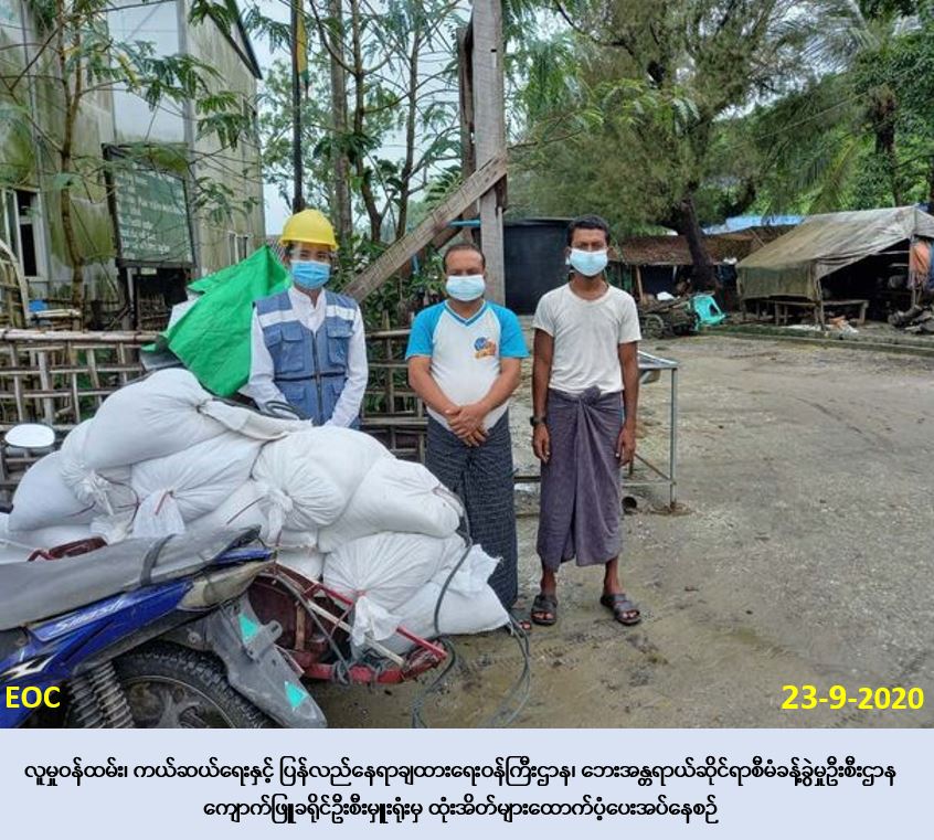 လူမှုဝန်ထမ်း၊ ကယ်ဆယ်ရေးနှင့် ပြန်လည်နေရာချထားရေးဝန်ကြီးဌာန၊ ဘေးအန္တရာယ်ဆိုင်ရာ စီမံခန့်ခွဲမှုဦးစီးဌာန၊ ကျောက်ဖြူခရိုင်ဦးစီးမှူးရုံးမှ တာဝန်ရှိသူများသည် ကျောက်ဖြူမြို့နယ်၊ ဂုံးချွိန်ကျေးရွာအုပ်စု၊ ကျောက်တစ်လုံး IDP စခန်းတွင် COVID-19 ကူးစက်ရောဂါ ကြိုတင် ကာကွယ်ရေးပစ္စည်းများဖြစ်သည့် ထုံး (၁၀-ပိဿာပါ) ၃လစာ (သြဂုတ်၊စက်တင်ဘာ၊ အောက်တိုဘာ) (၁၅) အိတ်တို့အား (၂၃-၉-၂၀၂၀) ရက်နေ့၊ နံနက် (၁၁:၃၀) နာရီအချိန်တွင် စခန်းစီမံခန့်ခွဲမှုကော်မတီဝင်များထံသို့ သွားရောက်ထောက်ပံ့ပေးအပ်ခဲ့ကြောင်း သတင်းရရှိ ပါသည်။ #otr #rke_sep2020 Source: ကျောက်ဖြူခရိုင်ဦးစီးမှူးရုံး (ဘစမ)
