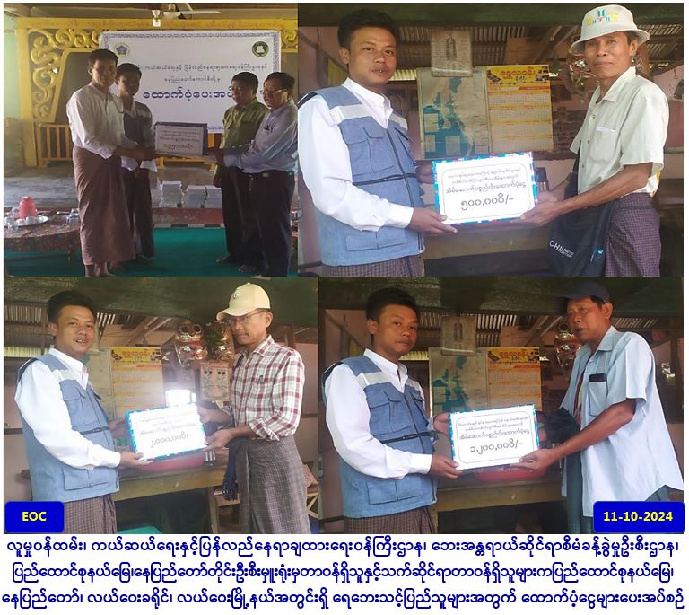 လူမှု၀န်ထမ်း၊ ကယ်ဆယ်ရေးနှင့်ပြန်လည်နေရာချထားရေး၀န်ကြီးဌာန၊ ဘေးအန္တရာယ်ဆိုင်ရာစီမံခန့်ခွဲမှုဦးစီးဌာန၊ ဥတ္တရခရိုင်ဦးစီးမှူးရုံးမှ တာဝန်ရှိသူများသည် ပြည်ထောင်စုနယ်မြေ၊ နေပြည်တော်၊ ဥတ္တရခရိုင်၊ တပ်ကုန်းမြို့နယ်၌ (၁၁-၉-၂၀၂၄)ရက်နေ့တွင် ဖြစ်ပွားခဲ့သော ရေဘေးကြောင့် လုံးဝပျက်စီးနေအိမ် (၃၀၇)လုံးအတွက် အိမ်ဆောက်ပစ္စည်းဖိုးထောက်ပံ့ငွေ (၃၀၇၀၀၀၀၀/-)၊ ကယ်ဆယ်ရေးပစ္စည်း (၁၆) မျိုး (၁၀၇၆၇၈/-)၊ (၃၀၇) အိမ်ထောင်စုစာ (၃၃၀၅၇၁၄၆/-)နှင့် တစ်စိတ်တစ်ပိုင်းပျက်စီးနေအိမ် (၃၆၂)လုံးအတွက် အိမ်ဆောက်ပစ္စည်းဖိုးထောက်ပံ့ငွေ (၁၈၁၀၀၀၀၀/-) တို့အား နေပြည်တော်ကောင်စီဝင် ဦးဇေယျာလင်း၊ ဥတ္တရခရိုင်စီမံအုပ်ချုပ်ရေးအဖွဲ့ဥက္ကဌ ဦးမြတ်အောင်ဌေး၊ တပ်ကုန်းမြို့နယ် အထွေထွေအုပ်ချုပ်ရေးဦးစီးဌာနမှ မြို့နယ်အုပ်ချုပ်ရေးမှူး ဦးညီညီထွေး၊ ဌာနဆိုင်ရာမှ တာဝန်ရှိသူများနှင့်အတူ (၁၂-၁၀-၂၀၂၄) … Read more