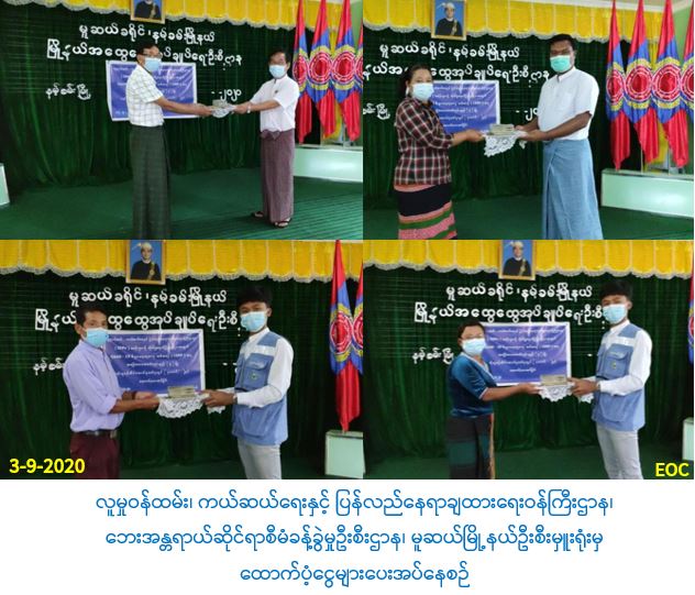 လူမှုဝန်ထမ်း၊ ကယ်ဆယ်ရေးနှင့် ပြန်လည်နေရာချထားရေးဝန်ကြီးဌာန၊ ဘေးအန္တရာယ်ဆိုင်ရာစီမံခန့်ခွဲမှုဦးစီးဌာန၊ မိုးညိုမြို့နယ်ဦးစီးမှူးရုံးမှ တာဝန်ရှိသူများသည် (၁၄/၁၅-၉-၂၀၂၀) ရက်နေ့တို့၌ ပဲခူးတိုင်းဒေသကြီး၊ သာယာဝတီခရိုင်၊ မိုးညိုမြို့နယ်၊ ရွှေခဲကျေးရွာအုပ်စု၊ ရွှေခဲကျေးရွာတွင် ဖြစ်ပွားခဲ့သော ကမ်းပြိုဘေးမှ ကြိုတင်ပြောင်းရွှေ့ ဘုန်းတော်ကြီးကျောင်းဆောင် (၂) ဆောင်အတွက် ကျောင်းဆောက်ပစ္စည်းဖိုးထောက်ပံ့ငွေ (၂၀၀,၀၀၀) ကျပ်အား (၁၇-၉-၂၀၂၀) ရက်နေ့ (၁၂:၀၀) နာရီအချိန်တွင် ဘေးသင့်နေအိမ်၌ မြို့နယ်အထွေထွေအုပ်ချုပ်ရေးဦးစီးဌာနမှ တာဝန်ရှိသူများ၊ မြို့နယ်ရဲတပ်ဖွဲ့မှတာဝန်ရှိသူများ၊ မြို့နယ်မီးသတ်တပ်ဖွဲ့ဝင်များ၊ မြို့နယ်ကြက်ခြေနီအဖွဲ့ဝင်များ၊ မြို့နယ်လူငယ်ရေးရာအတွင်းရေးမှူး၊ ကျေးရွာအုပ်ချုပ်ရေးမှူးနှင့်အတူ ပြည်သူလက်ဝယ်အရောက် ထောက်ပံ့ပေးအပ်ခဲ့ပါကြောင်း သတင်းရရှိပါသည်။ Source: မိုးညိုမြို့နယ်ဦးစီးမှူးရုံး (ဘစမ) … Read more