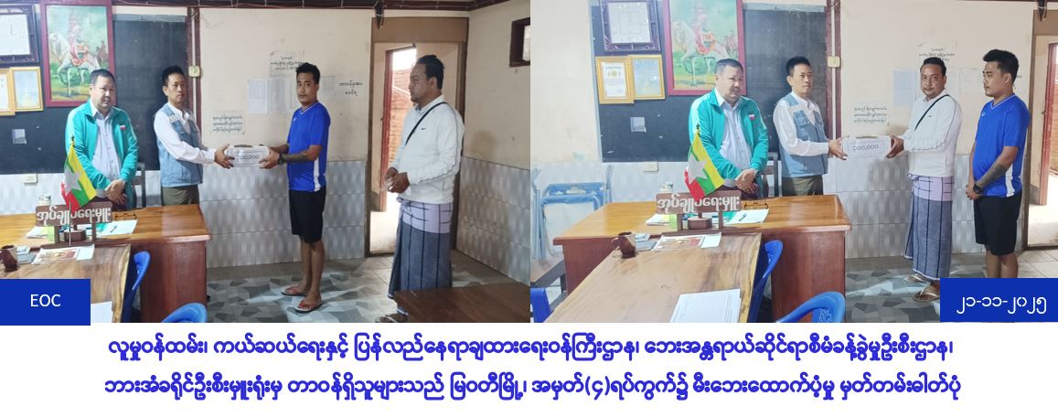လူမှုဝန်ထမ်း၊ ကယ်ဆယ်ရေးနှင့် ပြန်လည်နေရာချထားရေးဝန်ကြီးဌာန၊ ဘေးအန္တရာယ်ဆိုင် ရာစီမံခန့်ခွဲမှုဦးစီးဌာန၊ ဘားအံခရိုင်ဦးစီးမှူးရုံးမှ တာဝန်ရှိသူများသည် (၁၆-၁၁-၂၀၂၅)ရက်နေ့တွင် မြဝတီမြို့၊ အမှတ် (၄)ရပ်ကွက်၌ ဖြစ်ပွားခဲ့သည့် ထိပ်တန်းဟိုတယ် မီးလောင်ကျွမ်းမှုကြောင့် သေဆုံးခဲ့သူ(၂)ဦးအတွက် သေဆုံးရန်ပုံငွေ(၆၀၀,၀၀ဝိ/-)အား (၂၀-၁၁-၂၀၂၅)ရက်နေ့တွင် သေဆုံးသူမိသားစုဝင်များ၏ လက်ဝယ်အရောက် ထောက်ပံ့ပေးအပ်ခဲ့ပါကြောင်း သတင်းရရှိပါသည်။ # fir #kayin_November_2025 Source: ဘားအံခရိုင်ဦးစီးမှူးရုံး (ဘစမ)