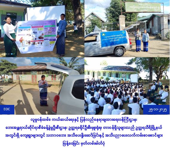 လူမှုဝန်ထမ်း၊ ကယ်ဆယ်ရေးနှင့် ပြန်လည်နေရာချထားရေးဝန်ကြီးဌာန၊ ဘေးအန္တရာယ်ဆိုင် ရာစီမံခန့်ခွဲမှုဦးစီးဌာန၊ ဥတ္တရခရိုင်ဦးစီးမှူးရုံးမှ တာဝန်ရှိသူများသည် (၂၅.၁၁.၂၀၂၅ )ရက်နေ့၊ နံနက် (၉း၃၀)အချိန်မှ (၁၂း၀၀)အချိန်ထိ ဥတ္တရသီရိမြို့နယ်၊သရက်တောကျေးရွာအုပ်စု၊ အ.ထ.က (သရက်တော) တွင် ကျောင်း သားကျောင်းသူ (၂၅၀) ဦးနှင့် ဆရာဆရာမ (၁၅)ဦးတို့အား ရာသီအလိုက် ဖြစ်ပွားတတ်သော သဘာဝဘေးအန္တရာယ်များနှင့်ပတ်သတ်၍ ဆောင်ရန်/ ရှောင်ရန်များအား အသိပညာပေးဟောပြောပွဲဆောင်ရွက်ခဲ့၍ လက်ကမ်းစာစောင်နှင့် နံရံကပ်ပိုစတာများ ဖြန့်ဝေခဲ့ပြီး၊ နေ့လည်(၁၃:၀၀)အချိန်မှ (၁၆:၀၀)အချိန်အထိ ဥတ္တရသီရိမြို့နယ်၊ သရက်တောကျေးရွာအုပ်စု၊ သရက်တောကျေးရွာ၊ မသိမ်ကျေးရွာ၊ ပိုးစာတောကျေးရွာများတွင် ရာသီအလိုက်ဖြစ်ပွားတက်သော သဘာဝဘေးအန္တရာယ်များနှင့်ပတ်သတ်၍ … Read more