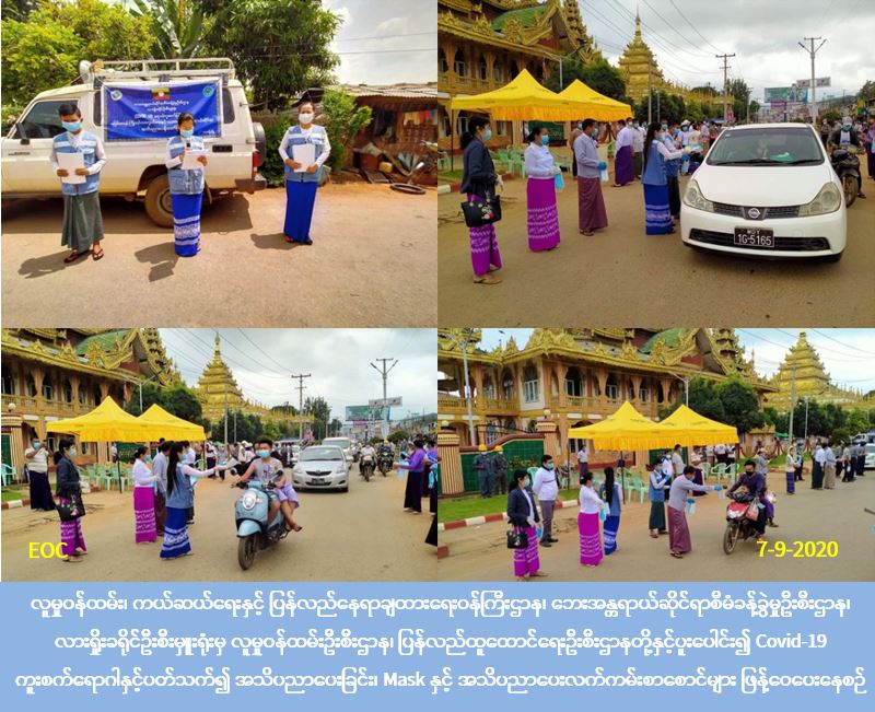လူမှုဝန်ထမ်း၊ ကယ်ဆယ်ရေးနှင့် ပြန်လည်နေရာချထားရေးဝန်ကြီးဌာန၊ ဘေးအန္တရာယ်ဆိုင်ရာစီမံခန့်ခွဲမှုဦးစီးဌာန၊ လားရှိုးခရိုင်ဦးစီးမှူးရုံးမှ တာဝန်ရှိသူများသည် (၇-၉-၂၀၂၀) ရက်နေ့တွင် လူမှုဝန်ထမ်းဦးစီးဌာန၊ ပြန်လည်ထူထောင်ရေးဦးစီးဌာနတို့နှင့်ပူးပေါင်း၍ လားရှိုးမြို့၊ မြို့တော်ခန်းမရှေ့၊ မန်ဆူကားကွင်းနှင့် နားမခေါ်ကားကွင်းတို့၌ Covid-19 ကူးစက်မှုမဖြစ်ပွားစေရန်ပြည်သူများ လိုက်နာရမည့်ကျန်းမာရေးအမူအကျင့်များ အသိပညာပေးခြင်းနှင့် သဘာဝဘေးဆိုင်ရာအသိပညာပေးခြင်းများကို အသံချဲ့စက်များဖြင့် လှည့်လည်ဟောပြောခဲ့ပြီး Mask နှင့် အသိပညာပေးလက်ကမ်းစာစောင်များ ဖြန့်ပေးဝေခြင်း၊ Hand Gel များဖြင့် လက်သန့်စင်ပေးခြင်းတို့အား ဆောင်ရွက်ခဲ့ပါကြောင်း သတင်းရရှိပါသည်။ Source: လားရှိုးခရိုင်ဦးစီးမှူးရုံး (ဘစမ) #ar #shn_sep2020