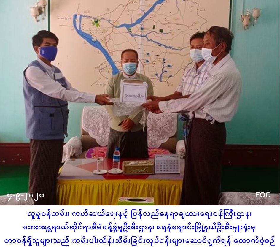လူမှုဝန်ထမ်း၊ ကယ်ဆယ်ရေးနှင့် ပြန်လည်နေရာချထားရေးဝန်ကြီးဌာန၊ ဘေးအန္တရာယ်ဆိုင်ရာစီမံခန့်ခွဲမှုဦးစီးဌာန၊ မိုးညိုမြို့နယ်ဦးစီးမှူးရုံးမှ တာဝန်ရှိသူများသည် (၃-၉-၂၀၂၀) ရက်နေ့၌ ပဲခူးတိုင်းဒေသကြီး၊ သာယာဝတီခရိုင်၊ မိုးညိုမြို့နယ်၊ ဆင်ခေါင်းကျေးရွာအုပ်စု၊ မိုးညိုလေးကျေးရွာတွင် ဖြစ်ပွားခဲ့သော ရေဘေးမှ သစ်ပင်ပိတစ်စိတ်တစ်ပိုင်း ပျက်စီးနေအိမ် (၁) လုံးအတွက် အိမ်ဆောက်ပစ္စည်းဖိုးထောက်ပံ့ငွေ (၅၀,၀၀၀) ကျပ်၊ အိမ်ထောင်စု (၁) စုရှိ စုစုပေါင်းလူဦးရေ (၅) ဦးအတွက် ဆန်ရိက္ခါ (၇) ရက်စာဖိုးထောက်ပံငွေ (၁၀,၅၀၀) ကျပ်၊ စုစုပေါင်းထောက်ပံ့ငွေ (၆၀,၅၀၀) ကျပ်အား (၄-၉-၂၀၂၀) ရက်နေ့ (၁၁း၀၀) နာရီအချိန်တွင် … Read more