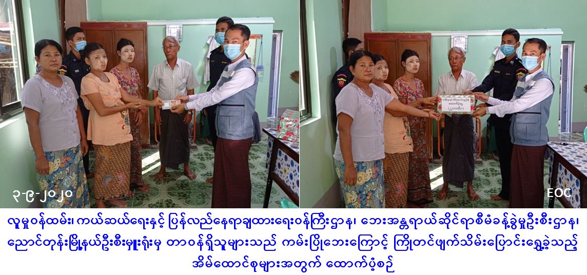 လူမှုဝန်ထမ်း၊ ကယ်ဆယ်ရေးနှင့် ပြန်လည်နေရာချထားရေးဝန်ကြီးဌာန၊ ဘေးအန္တရာယ်ဆိုင်ရာစီမံခန့်ခွဲမှုဦးစီးဌာန၊ သထုံခရိုင်ဦးစီးမှူးရုံးမှ တာဝန်ရှိသူများသည် (၃-၉-၂၀၂၀) ရက်နေ့၊ (၁၀:၀၀)နာရီအချိန်တွင် မွန်ပြည်နယ်၊ သထုံခရိုင်၊ ပေါင်မြို့နယ်၊ လက်ပံကျွန်းကျေးရွာအုပ်စု၊ ကုလားစုကျေးရွာ၌ ရေတိုက်စားမှုကြောင့် ကမ်းပြိုကျ၍ ကြိုတင်ရွှေ့ပြောင်းခဲ့သည့် လူနေအိမ်(၂)လုံးအတွက် အိမ်ဆောက်ပစ္စည်းဖိုးထောက်ပံ့ငွေ (၂၀၀,၀၀ဝ/-)ကျပ်နှင့် လူဦးရေ (၁၃) ဦးတို့အတွက် (၇)ရက်စာဆန်ရိက္ခာဖိုးထောက်ပံ့ငွေ(၂၇,၃၀ဝ/-)ကျပ်တို့အား (၄-၉-၂၀၂၀) ရက်နေ့၊ (၀၉:၃၀)နာရီအချိန်တွင် မြို့နယ်အထွေထွေအုပ်ချုပ်ရေးဦးစီးဌာန၌ ဘေးသင့်ပြည်သူများထံ လက်ဝယ်အရောက် ထောက်ပံ့ပေးအပ်ခဲ့ကြောင်း သတင်းရရှိပါသည်။ #ha_rbe #mon_sep2020 Source: သထုံခရိုင်ဦးစီးမှူးရုံး (ဘစမ)