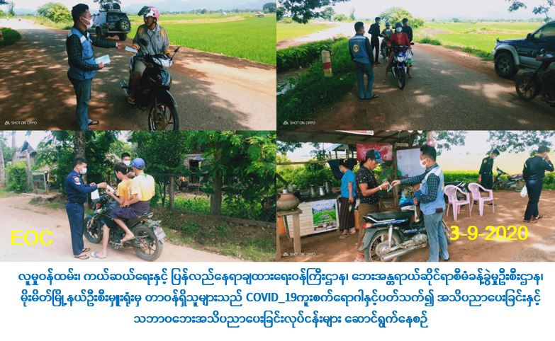 လူမှုဝန်ထမ်း၊ ကယ်ဆယ်ရေးနှင့် ပြန်လည်နေရာချထားရေးဝန်ကြီးဌာန၊ ဘေးအန္တရာယ် ဆိုင်ရာစီမံခန့်ခွဲမှုဦးစီးဌာန၊ မိုးမိတ်မြို့နယ်ဦးစီးမှူးရုံးမှ တာဝန်ရှိသူများသည် (၃-၉-၂၀၂၀) ရက်နေ့တွင် မီးသတ်ဦးစီးဌာနနှင့် ပူးပေါင်း၍ မိုးမိတ်မြို့နယ်၊ မိုးဘုံကျေးရွာ၊ မန်အုံကျေးရွာ၊ မန်ပတ်ကျေးရွာ၊ မန်ဖွယ်ကျေးရွာတို့တွင် Covid-19 ရောဂါကူးစက်မှုမဖြစ်ပွားစေရန် ပြည်သူများနေထိုင်ရမည့် ကျန်းမာရေးအမူအကျင့်များ အသိပညာပေးဟောပြောခြင်း၊ အခြားသော သဘာဝဘေးများနှင့်ပတ်သက်သည့် ဆောင်ရန်/ရှောင်ရန်များကို ကျေးရွာနေ ပြည်သူတို့အား အသိပညာပေးအစီအစဉ်ကို အသံချဲ့စက်အသုံးပြု၍ ဟောပြောခြင်း၊ နှာခေါင်းစည်း (Mask) များဖြန့်ဝေခြင်းနှင့် လက်ကမ်းစာစောင်များဖြန့်ဝေခြင်းလုပ်ငန်းတို့ကို ဆောင်ရွက်ခဲ့ကြောင်း သတင်းရရှိပါသည်။ Source: မိုးမိတ်မြို့နယ်ဦးစီးမှူးရုံး (ဘစမ) #ar #shn_sep2020
