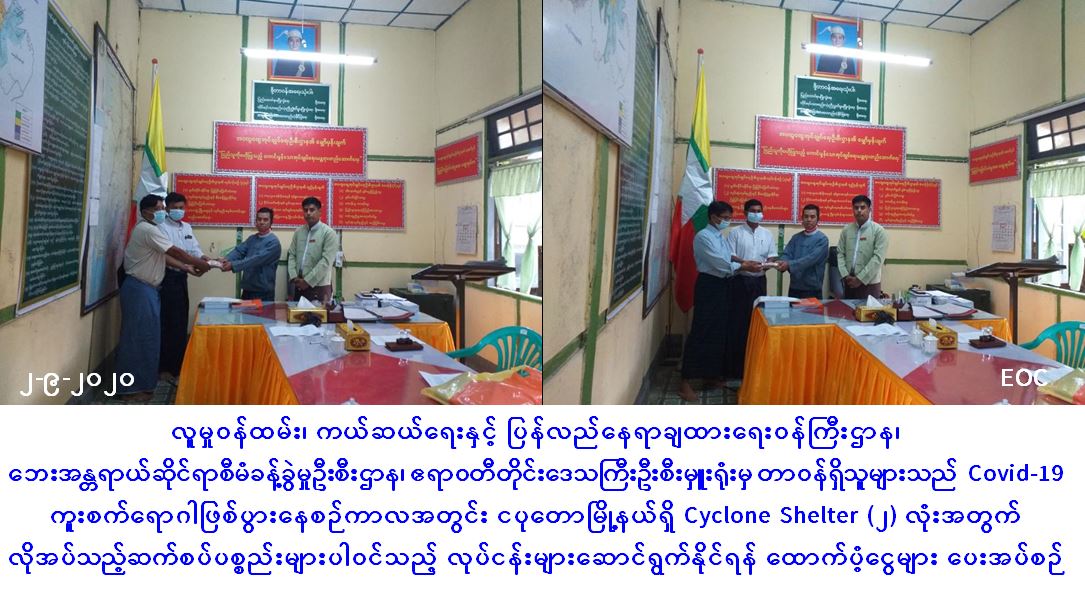 Covid-19 ကူးစက်ရောဂါဖြစ်ပွားနေစဉ်ကာလအတွင်း ငပုတောမြို့နယ်ရှိ Cyclone Shelter (၂) လုံးအတွက် လိုအပ်သည့် ဆက်စပ်ပစ္စည်းများပါဝင်သည့်လုပ်ငန်းများဆောင်ရွက်နိုင်ရန် ထောက်ပံ့ငွေ ပေးအပ်မှုသတင်း