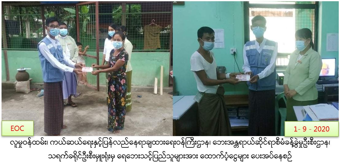 လူမှုဝန်ထမ်း၊ ကယ်ဆယ်ရေးနှင့် ပြန်လည်နေရာချထားရေးဝန်ကြီးဌာန၊ ဘေးအန္တရာယ်ဆိုင်ရာစီမံခန့်ခွဲမှုဦးစီးဌာန၊ ဗန်းမော်ခရိုင်ဦးစီးမှူးရုံးမှတာဝန်ရှိသူများသည် COVID19 စီးပွားရေးကုစားမှုအစီအစဥ် (CERP)အရ စားသောက်ကုန်(၅)မျိုးဝယ်ယူရန် အိမ်ထောင်စု (၁)စုလျှင် (၄၀၀၀၀) ကျပ်နှုန်းဖြင့် မိုးမောက်နှစ်ခြင်း IDps စခန်းတွင် အိမ်ထောင်စု(၄၁၇)၊ လူဦးရေ(၂၀၀၃)ဦးနှင့် မိုးမောက် RC IDps စခန်းတွင် အိမ်ထောင်စု(၈၈)စု၊ လူဦးရေ(၄၁၄)ဦး၊ စုစုပေါင်းအိမ်ထောင်စု(၅၀၅)ဦး၊ လူဦးရေ(၂၄၁၇)ဦးတို့အား စုစုပေါင်းထောက်ပံ့ငွေ (၂၀,၂၀၀,၀၀၀) ကျပ်တိတိ အား (၁-၉-၂၀၂၀) ရက်နေ့ (၁၅:၃၅) နာရီအချိန်တွင် IDps စခန်းနေ မိသားစုများ၏ လက်ဝယ်အရောက် ထောက်ပံ့ပေးအပ်ခဲ့ကြောင်း သတင်းရရှိပါသည်။ … Read more