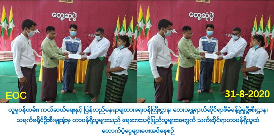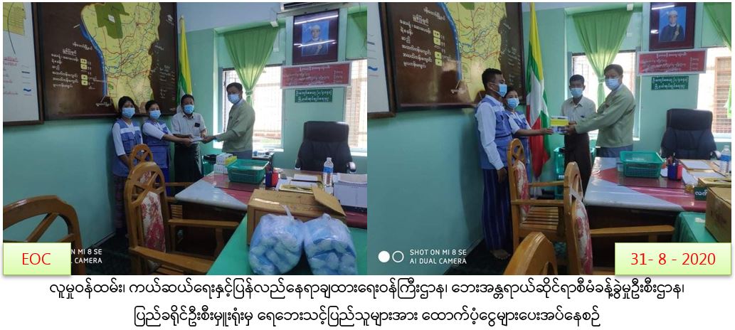 လူမှုဝန်ထမ်း၊ ကယ်ဆယ်ရေးနှင့်ပြန်လည်နေရာချထားရေးဝန်ကြီးဌာန၊ ဘေးအန္တရာယ်ဆိုင်ရာစီမံခန့်ခွဲမှုဦးစီးဌာန၊ ပြည်ခရိုင်ဦးစီးမှူးရုံးမှတာဝန်ရှိသူများသည် ပြည်မြို့နယ်၌ (၃၀-၈-၂၀၂၀)ရက်နေ့တွင် ဧရာဝတီမြစ်ရေမြင့်တက်မှုကြောင့် ရေဝင်ရောက်ခဲ့သော ပြည်သာယာရပ်ကွက်၊ ကုန်းသာလင်းအုပ်စု၊ ဇလုံအုပ်စုနှင့် အနောက်လက္ခုပ္ပင်အုပ်စုများမှ ပြောင်းရွှေ့ အိမ်ထောင်စု (၇၁)စု၊ လူဦး ရေ (၃၁၉)ဦးတို့အတွတ် ဆန်ရိက္ခာဖိုးထောက်ပံ့ငွေ စုစုပေါင်း(၆၆၉၉၀၀) ကျပ်၊ အိမ်ထောင်စု (၁)စုလျင်ဆပ်ပြာ (၁)တောင့်၊ Surgical Mask (၂)ခုနှုန်းဖြင့် ဆပ်ပြာ (၇၁)တောင့်နှင့် Surgical Mask (၆၃၈)ခုတို့အား (၃၁-၈-၂၀၂၀) ရက်နေ့၊ (၁၅:၀၀)နာရီအချိန်တွင် မြို့နယ်အုပ်ချုပ်ရေးမှူးရုံး၌ ဘေးသင့်ပြည်သူများထံ လက်ဝယ်အရောက် သွားရောက်ထောက်ပံ့ခဲ့ကြောင်း သတင်းရရှိပါသည်။ … Read more