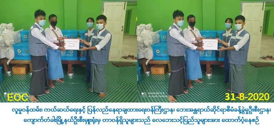 လူမှုဝန်ထမ်း၊ ကယ်ဆယ်ရေးနှင့် ပြန်လည်နေရာချထားရေးဝန်ကြီးဌာန၊ ဘေးအန္တရာယ်ဆိုင်ရာစီမံခန့်ခွဲမှုဦးစီးဌာန၊ ကွတ်ခိုင်မြို့နယ်ဦးစီးမှူးရုံးမှ တာဝန်ရှိသူများသည် (၃၁-၈-၂၀၂၀) ရက်နေ့တွင် ကွတ်ခိုင်မြို့နယ်အတွင်းရှိ IDP(camps) နမ့်ဖက်ကာနှစ်ခြင်းအသင်းတော်၌ အိမ်ထောင်စု(၅၇)၊ လူဦးရေ(၂၆၃)၊ နမ့်ဖက်ကာနယ်မြေ (၄) အတွင်းရှိ အိမ်ထောင်(၃၉)၊ လူဦးရေ(၁၂၂)၊ စုစုပေါင်းအိမ်ထောင်စု(၉၆)၊ လူဦးရေ(၃၈၅) ဦးအတွက် စခန်းတစ်ခုလျှင် ထုံး(၁၀)အိတ်နှုန်း၊ လူတစ်ဦးလျှင်ဆပ်ပြာ(၂)ခဲ နှုန်းဖြင့် စုစုပေါင်းထုံး (၂၀) အိတ်၊ လက်ဆေးဆပ်ပြာ(၇၇၀)ခဲတို့အား ထောက်ပံ့ပေးအပ်ခဲ့ပါကြောင်း သတင်းရရှိပါသည်။ Source: ကွတ်ခိုင်မြို့နယ်ဦးစီးမှူးရုံး (ဘစမ) #ar #shn_sep2020